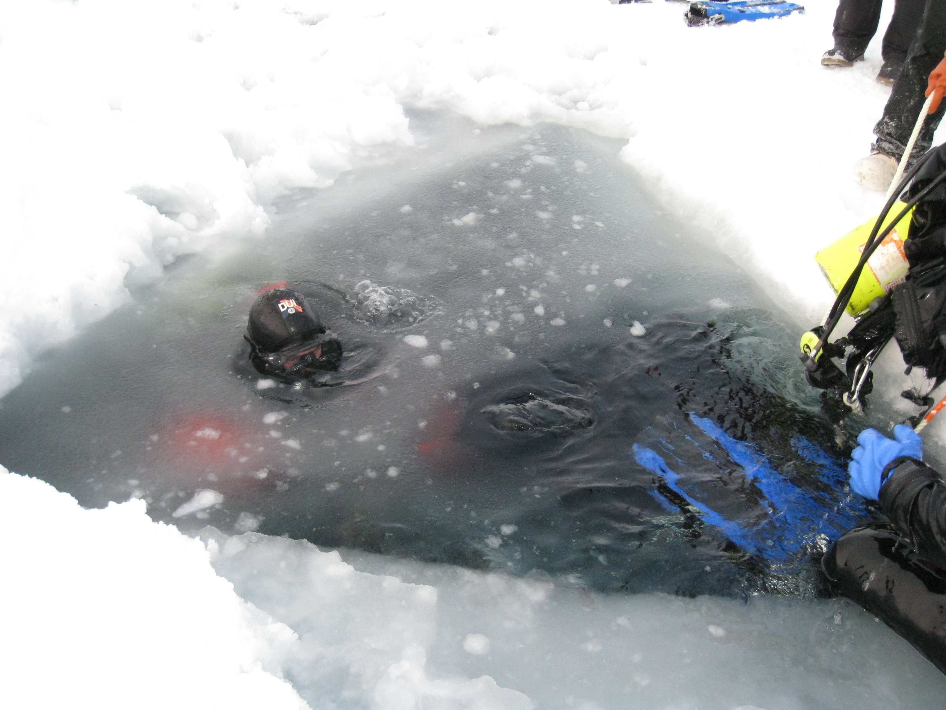 One of the divers arrives back to the surface. Ice chunks float in the water in the dive hole. On the sea ice, near the USCGC Polar Sea icebreaker in the Beaufort Sea.