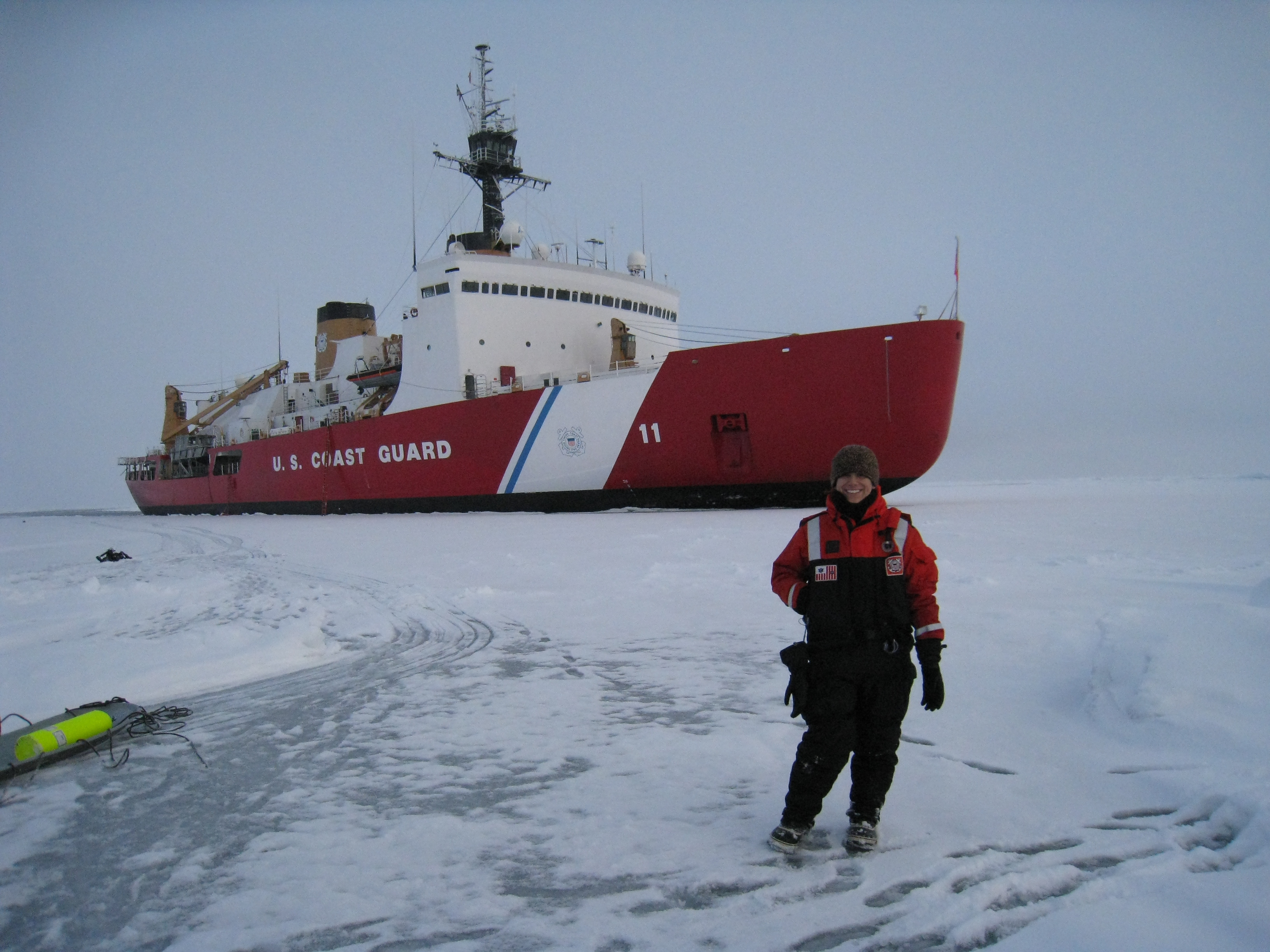 Cristina Galvan: "While the Polar Sea is lovely, it was nice to be off and on the ice for the afternoon." On the sea ice, near the USCGC Polar Sea icebreaker in the Beaufort Sea.