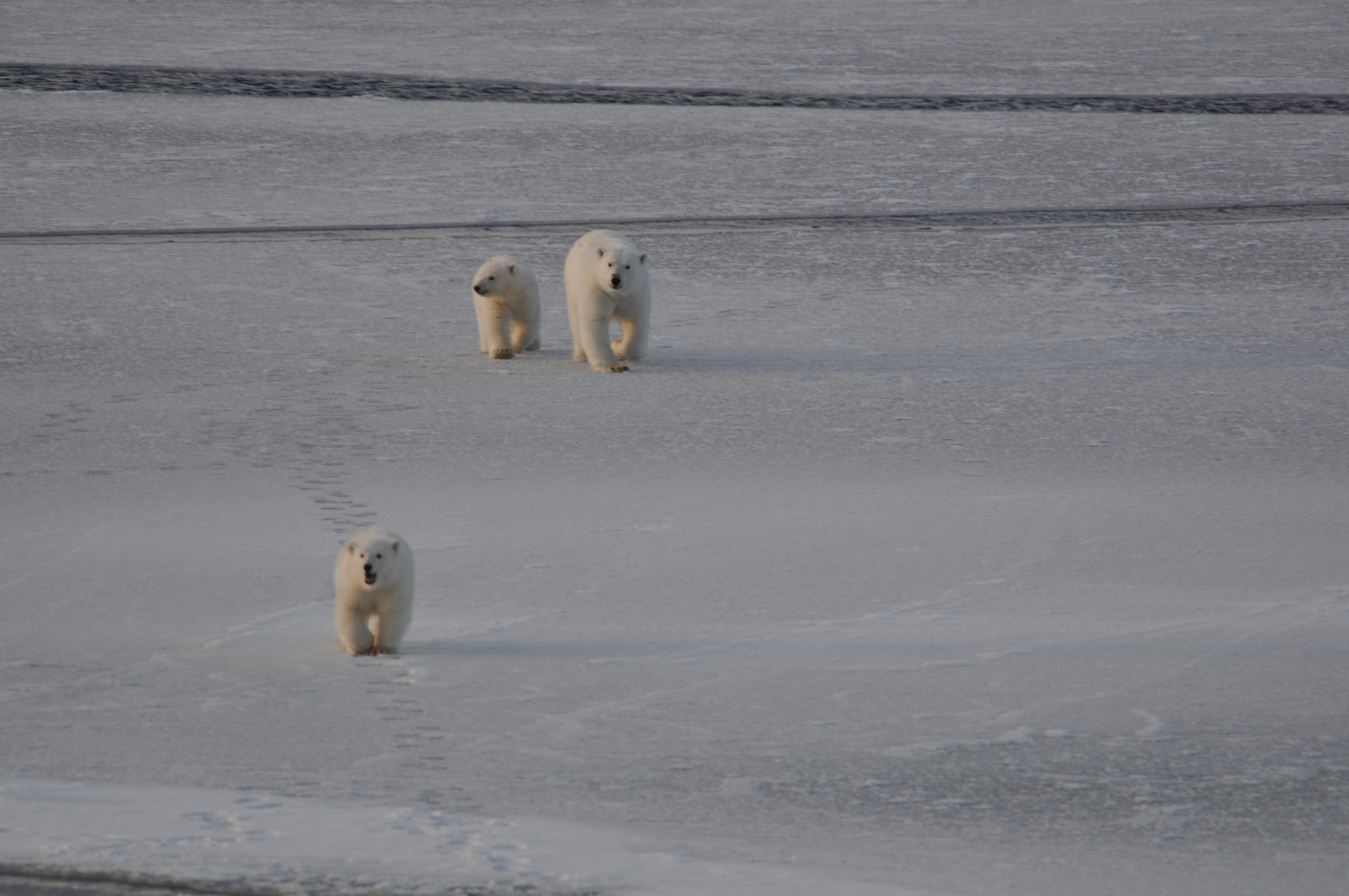 A polar bear with her two cubs. Aboard the USCGC Polar Sea icebreaker in the Beaufort Sea.