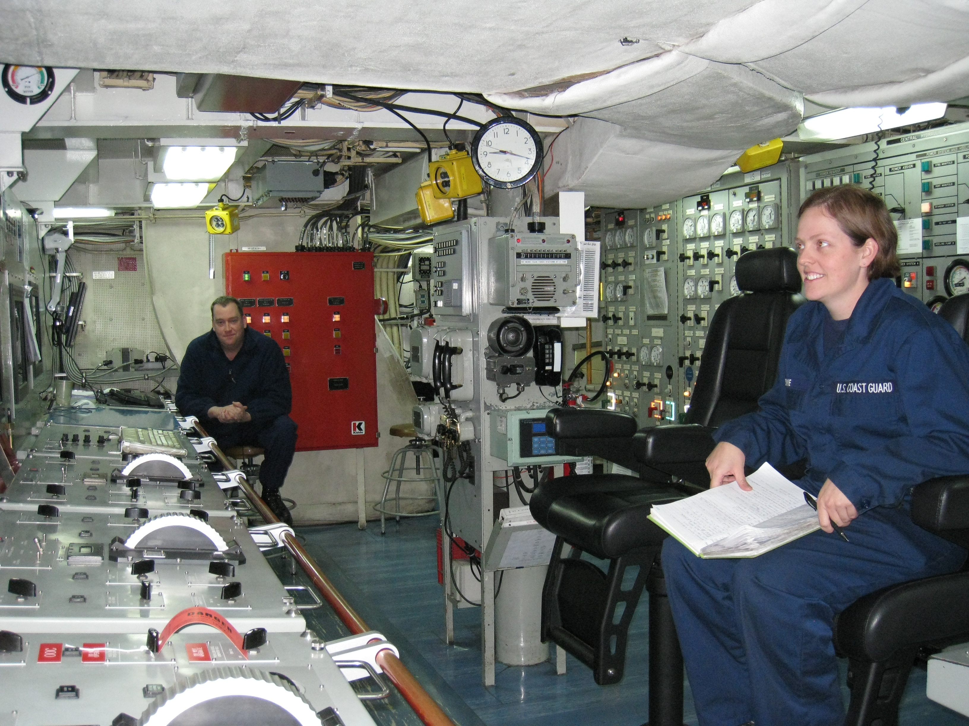 Chief Gaskons and First Class Electronics Technician Debra Bowing man the engine room. Aboard the USCGC Polar Sea icebreaker in the Beaufort Sea.