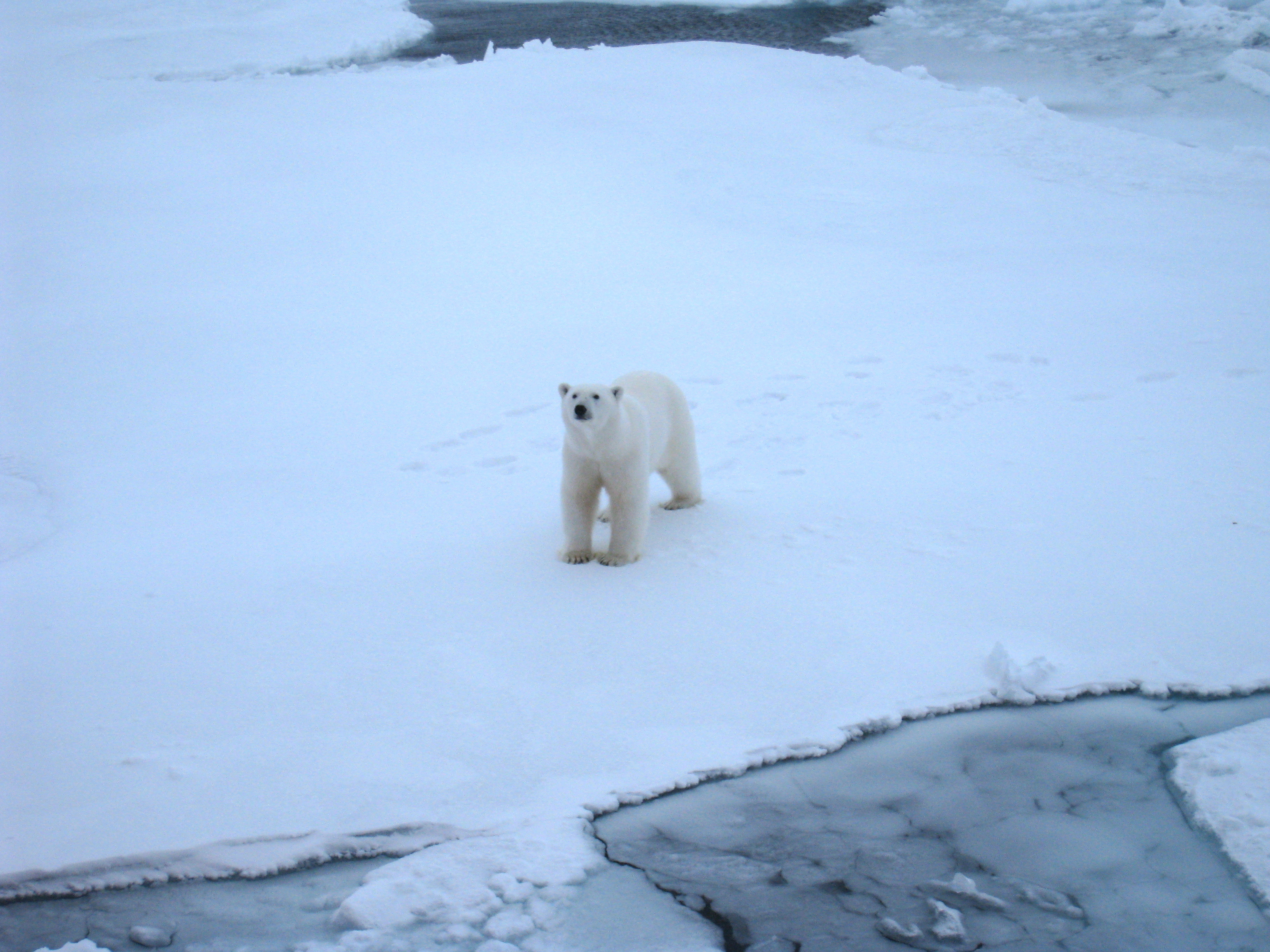 A polar bear on the sea ice, about 100 yards away. Aboard the USCGC Polar Sea icebreaker in the Beaufort Sea.