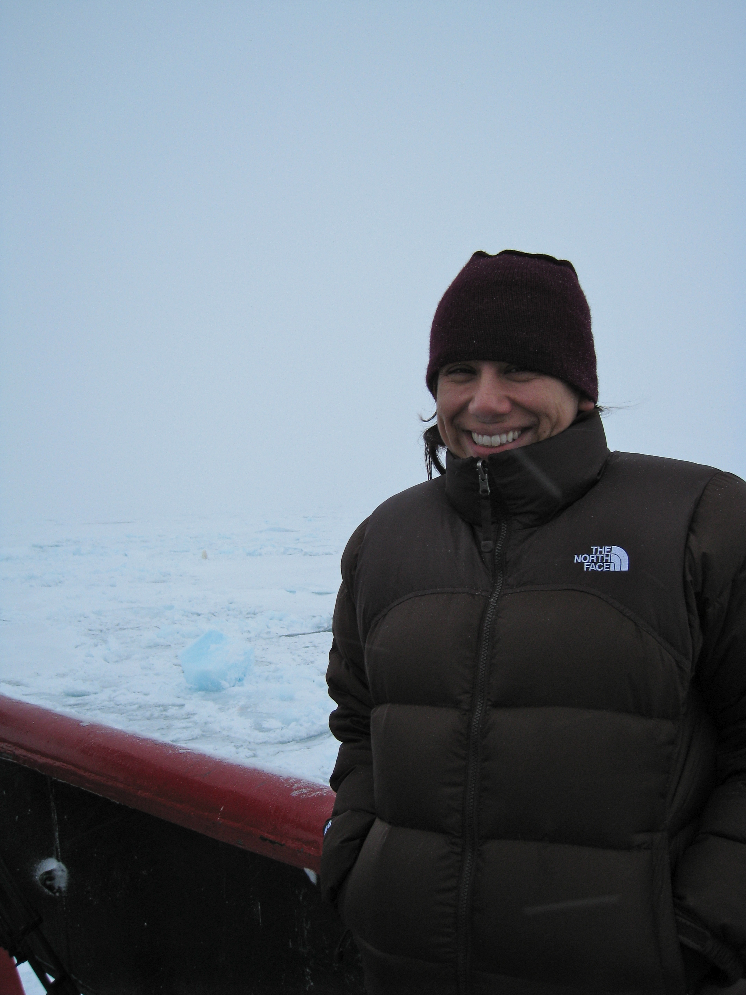 Cristina Galvan poses with the polar bear in the distant background. She adds, "If you squint your eyes and look to the left of me you can see a piece of yellowish white -- that's the polar bear!" Aboard the USCGC Polar Sea icebreaker in the Beaufort Sea.