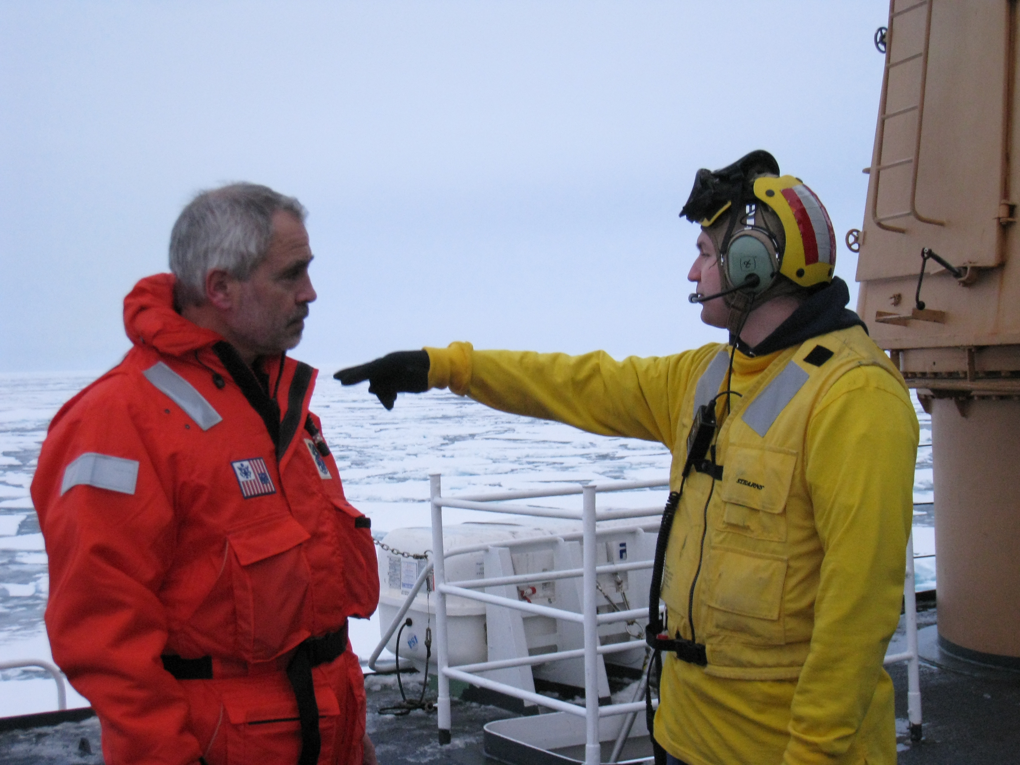 George Durner and Landing Signal Officer Verlindin discuss the ice conditions around the Polar Sea. Aboard the USCGC Polar Sea icebreaker in the Beaufort Sea.