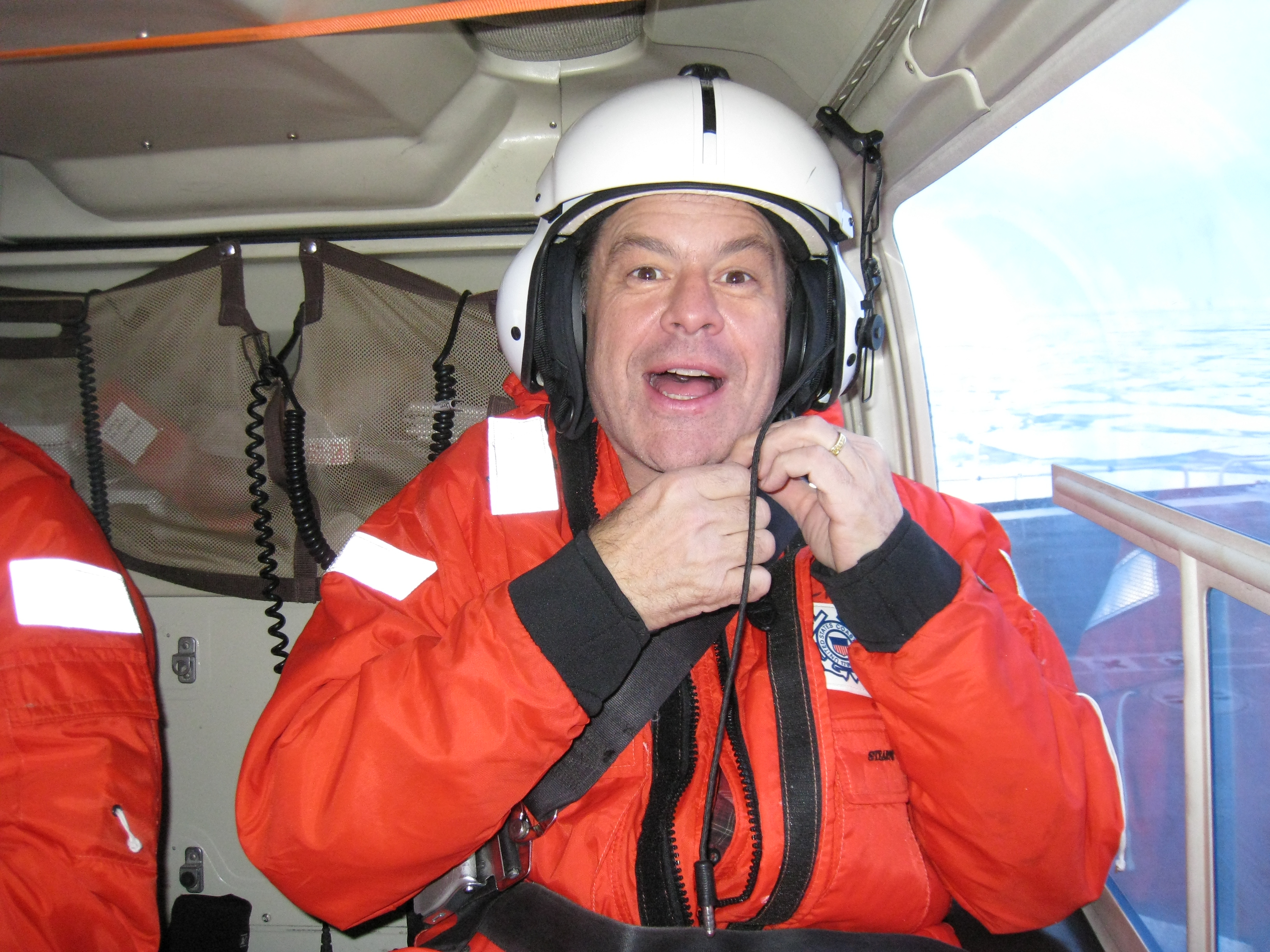 Photographer Dan Cox is excited to be in the helicopter. Aboard the USCGC Polar Sea icebreaker in the Beaufort Sea.