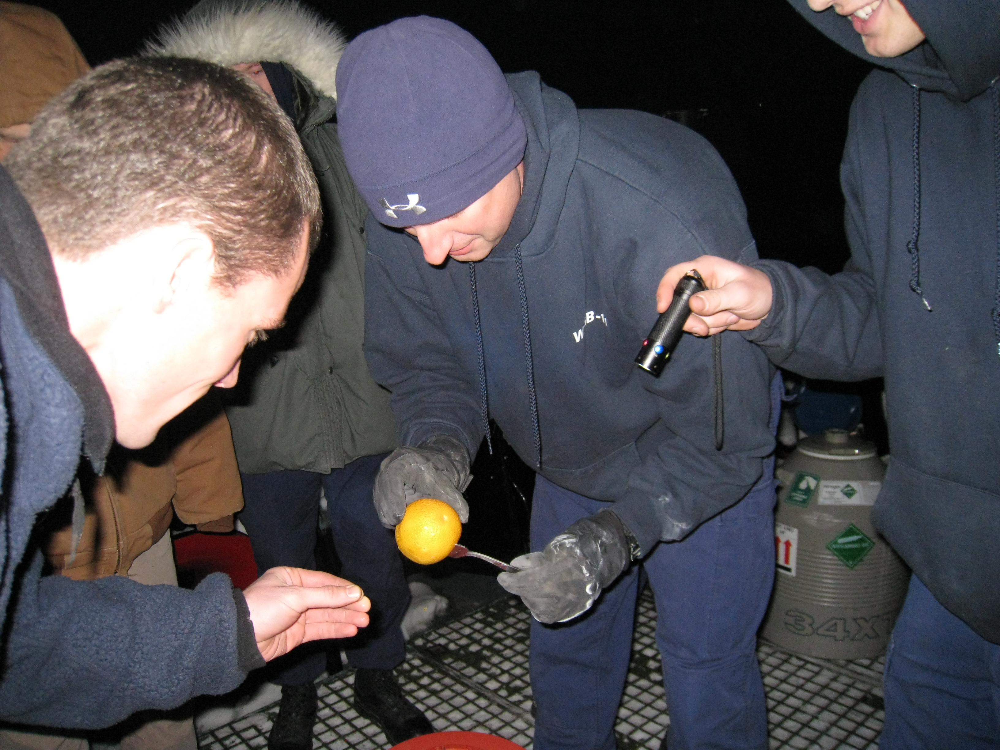An orange that was frozen with liquid nitrogen. Aboard the USCGC Polar Sea icebreaker in the Beaufort Sea.