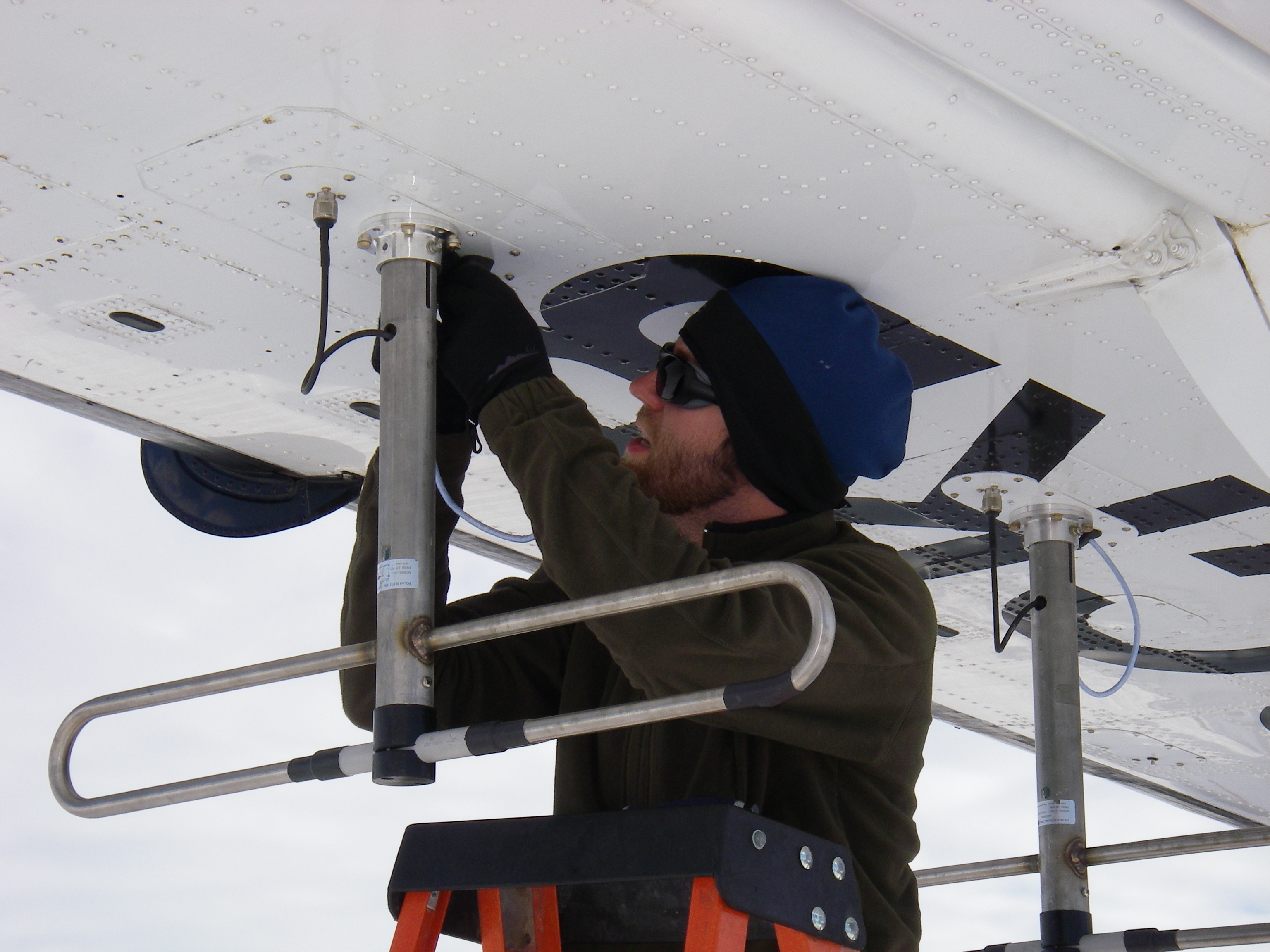 Cameron Lewis, grad student in electrical engineering at the University of Kansas, installs a CReSIS radar antenna onto the twin otter plane. On the Ice Runway near McMurdo Station, Antarctica.