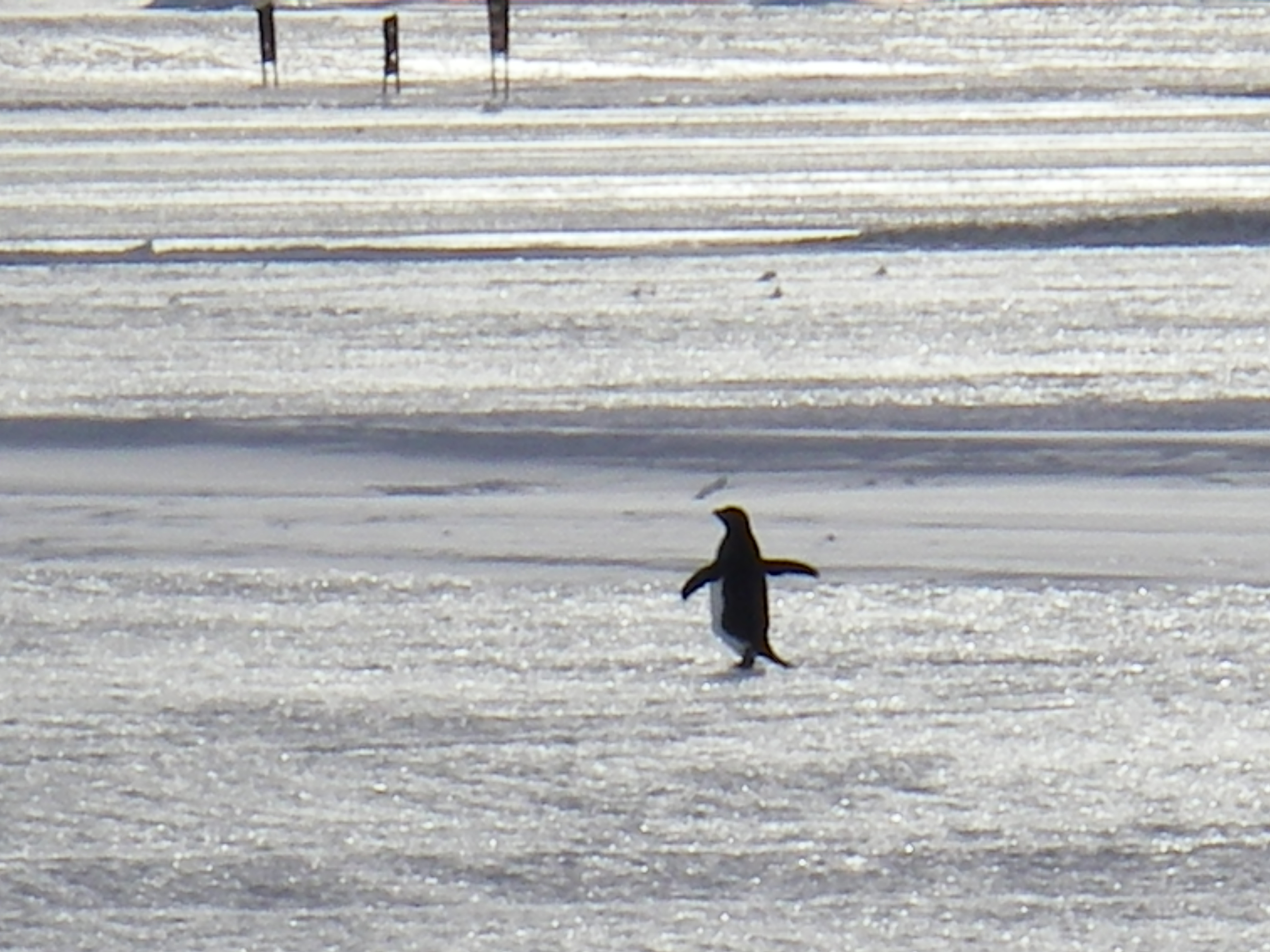 An Adélie penguin skips along on the Ice Runway near McMurdo Station, Antarctica.