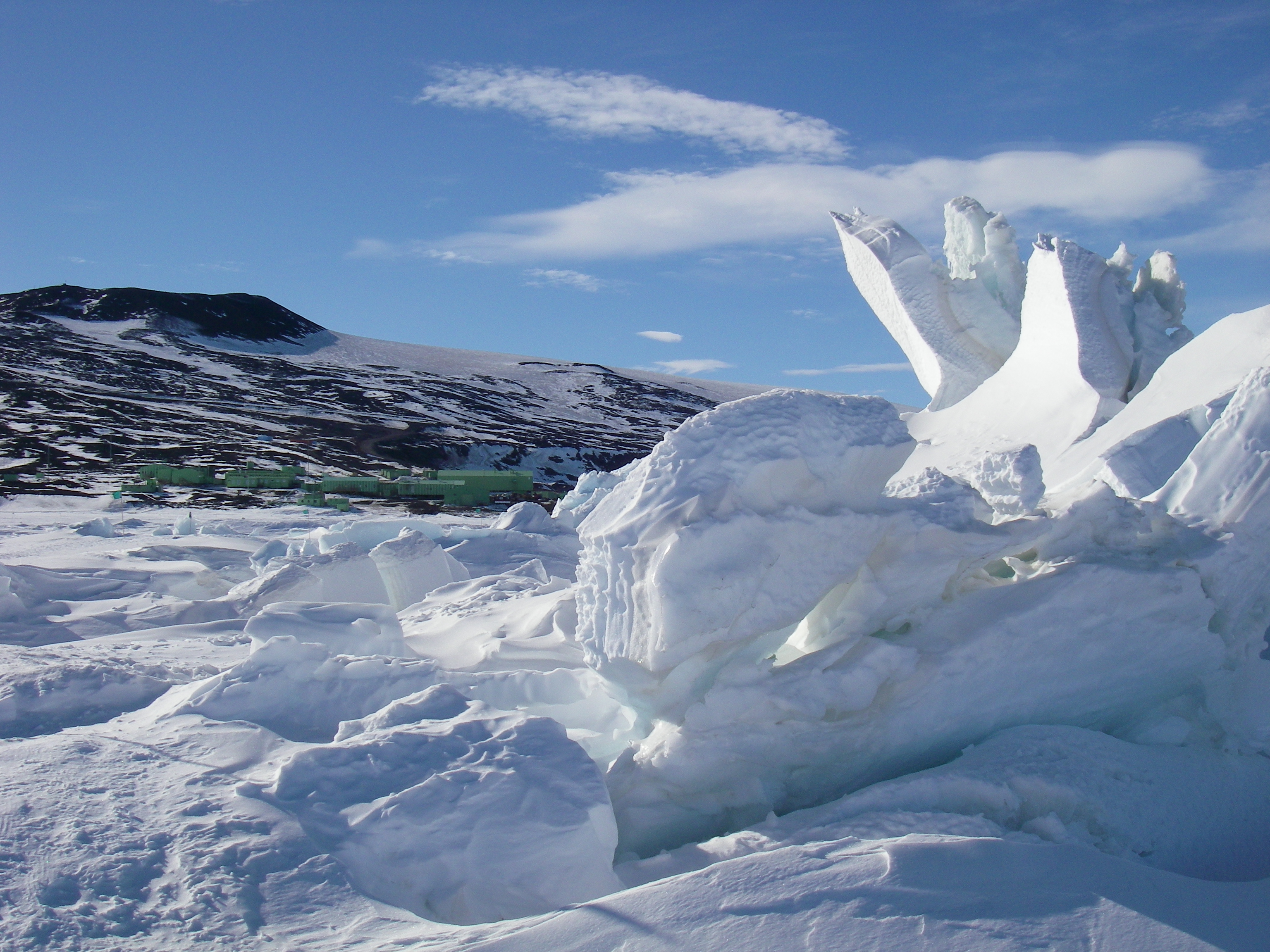 When sea ice pushes against an ice shelf a pressure ridge forms. Near McMurdo Station, Antarctica.