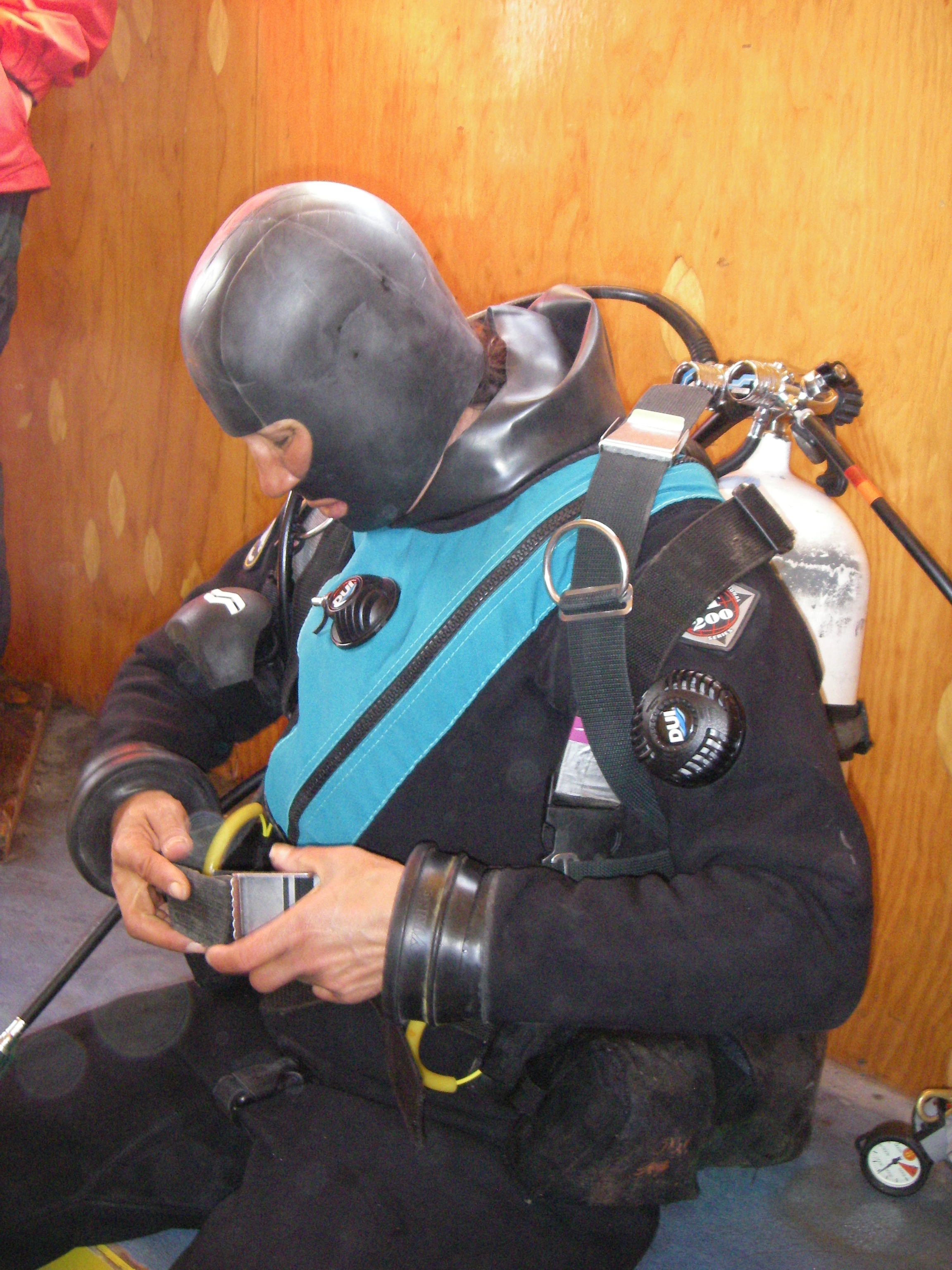 After 30 minutes of preparations, the air tanks are checked and the divers are ready to go under the ice. In a hut near McMurdo Station, Antarctica.