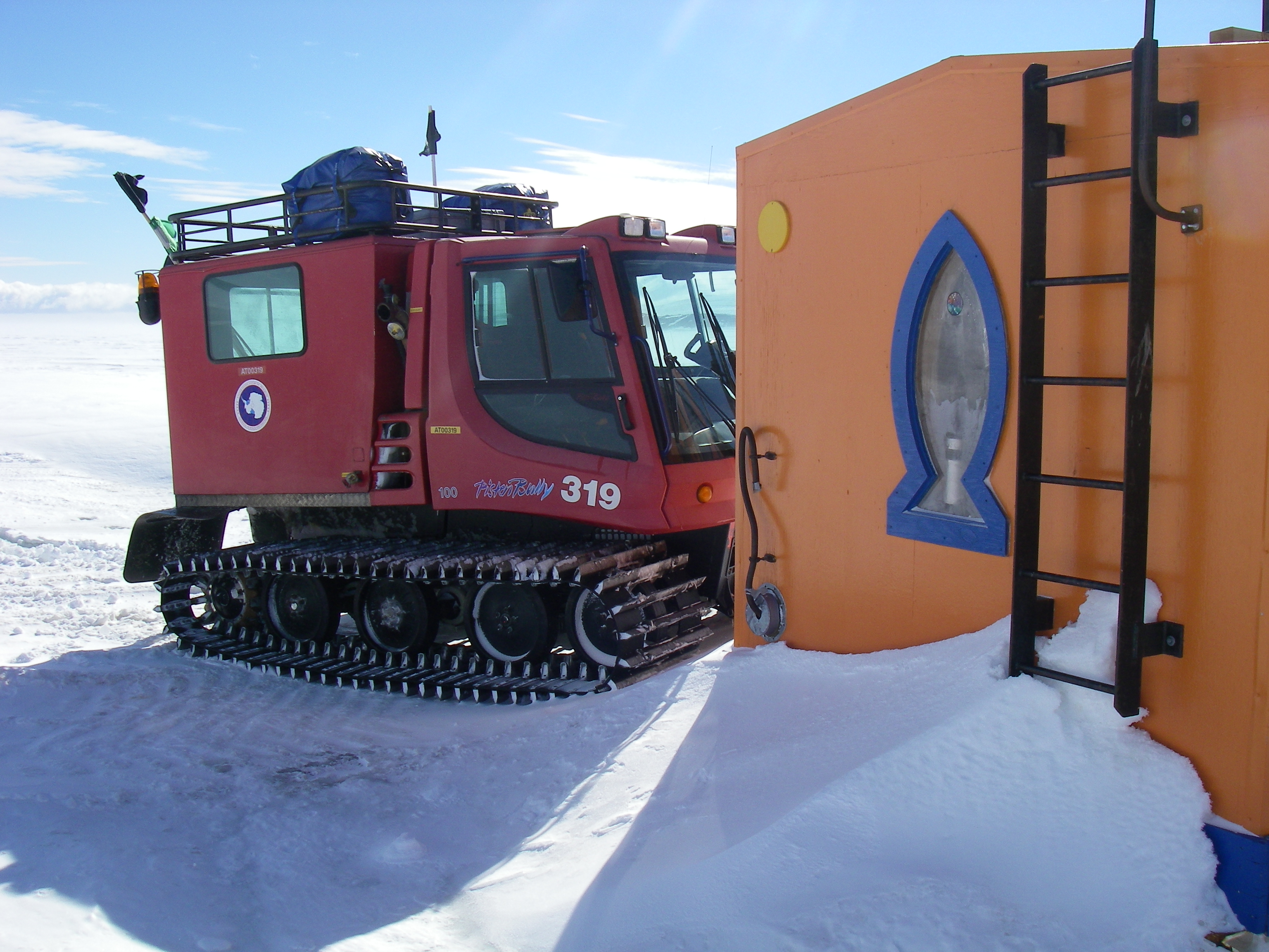 A fish hut is used to protect the sea ice dive hole and the divers. A Piston Bully vehicle is parked outside of the hut. It was used as transportation for the team to arrive at the fish hut. Near McMurdo Station, Antarctica.