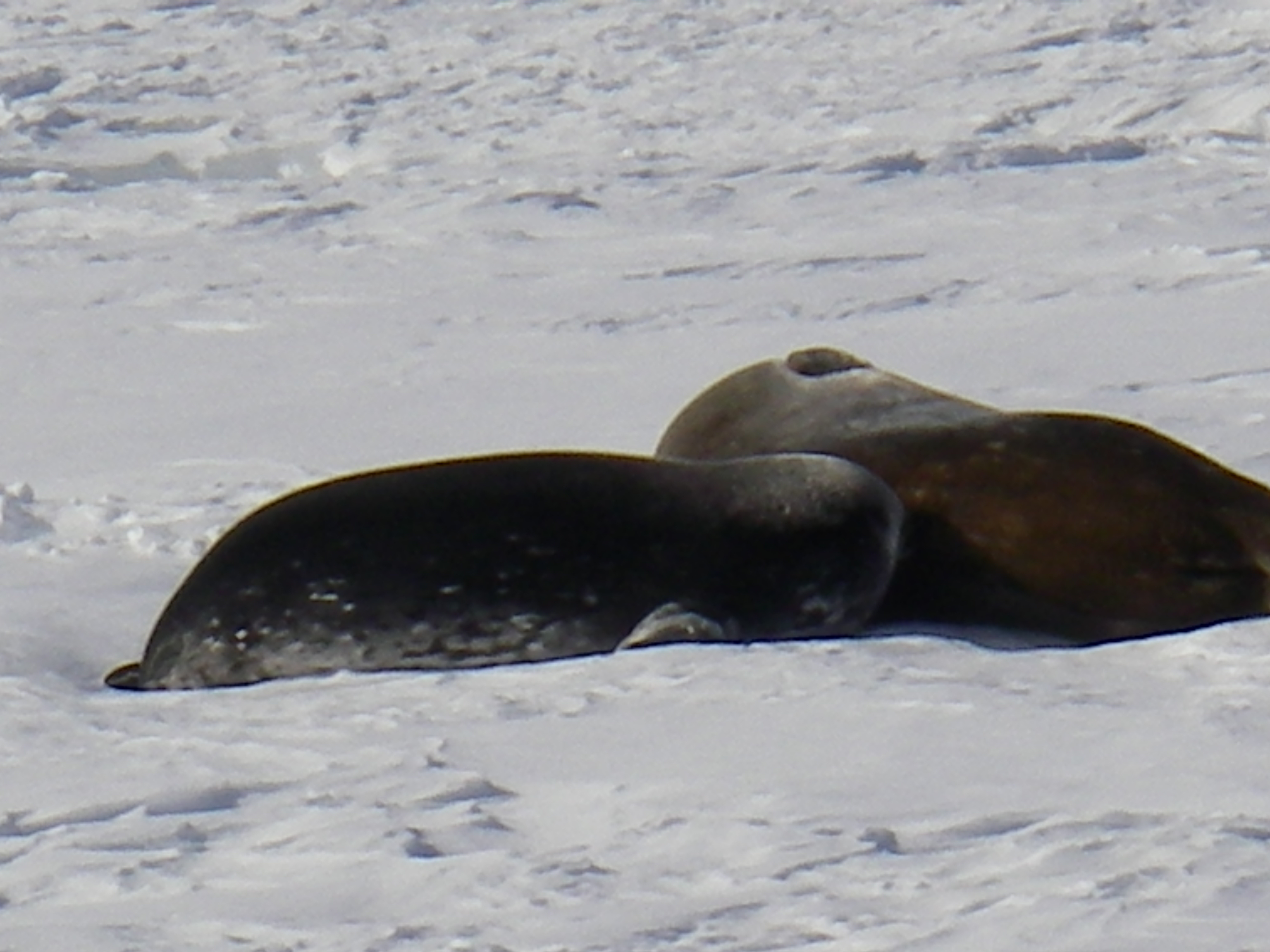 A mother Weddell seal nurses her pup. On the sea ice near McMurdo Station, Antarctica.