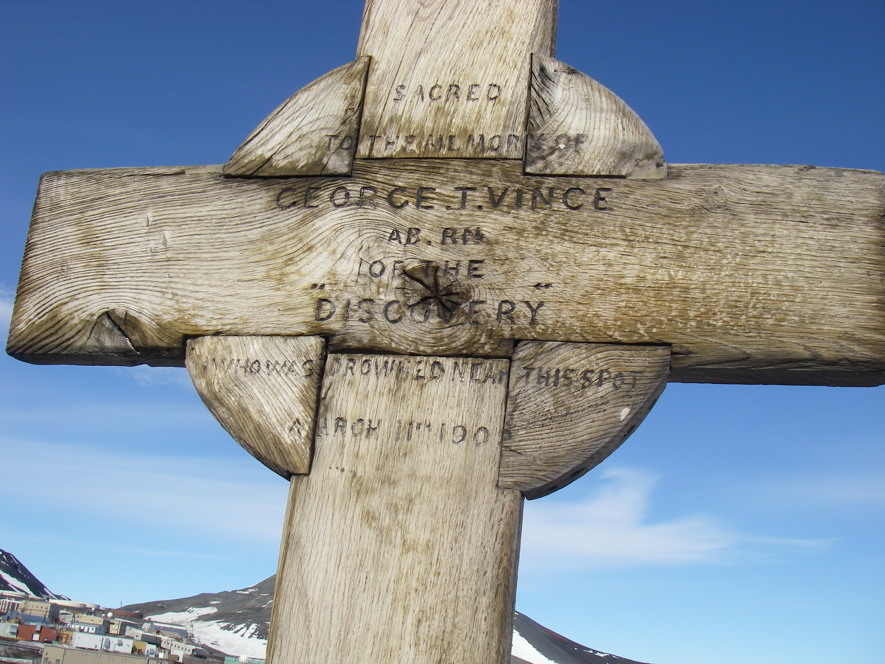 The Discovery Hut monument is in Memory of George T. Vince, a crew member of the Discovery Expedition. Outside the Discovery Hut at Hut's Point, near McMurdo Station, Antarctica.