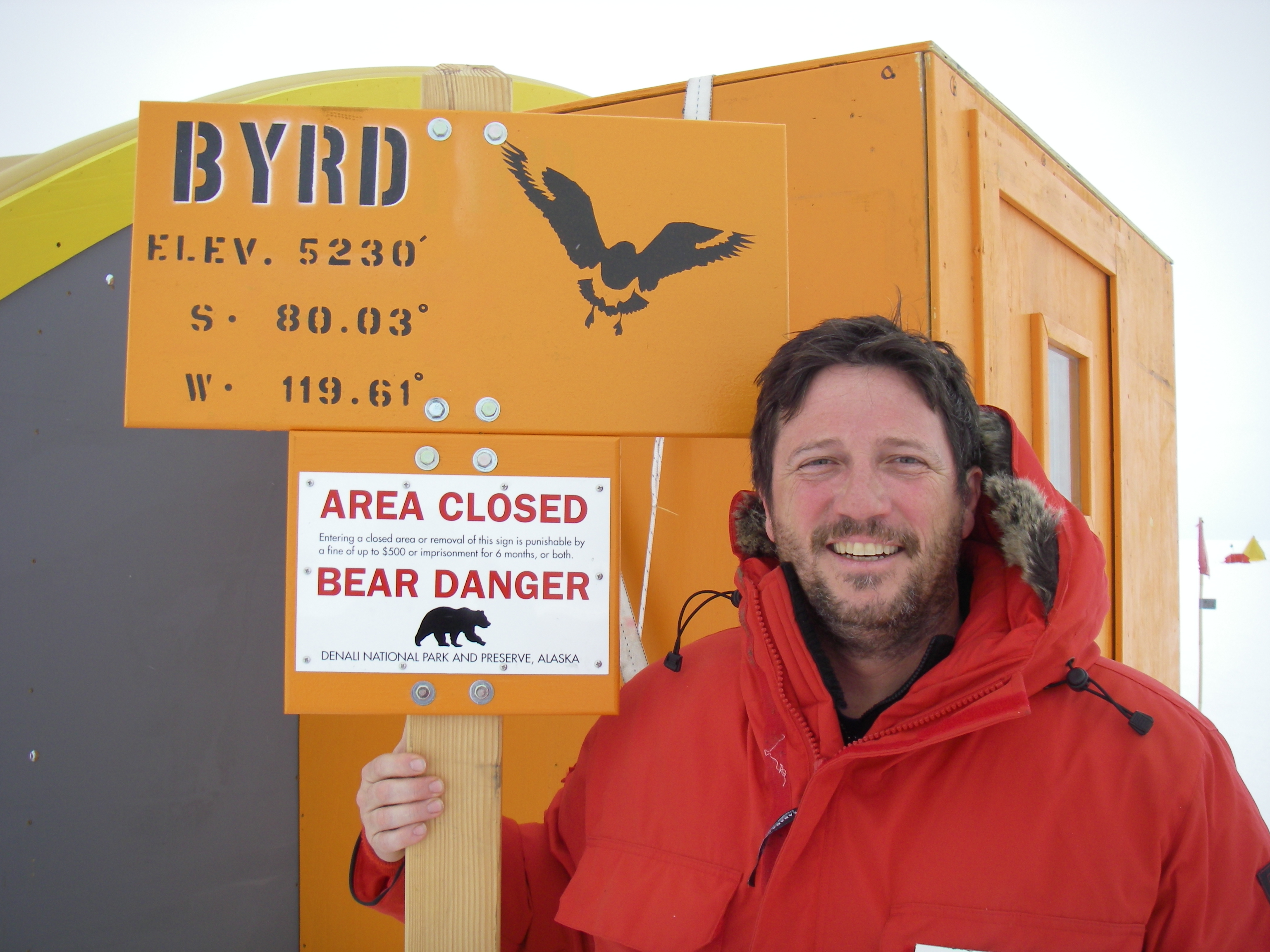 Gary Wesche poses in front of the sign at Byrd Surface Camp, Antarctica. The 'Bear Danger' sign is a joke (and is from Denali National Park in Alaska). There are no bears in Antarctica.