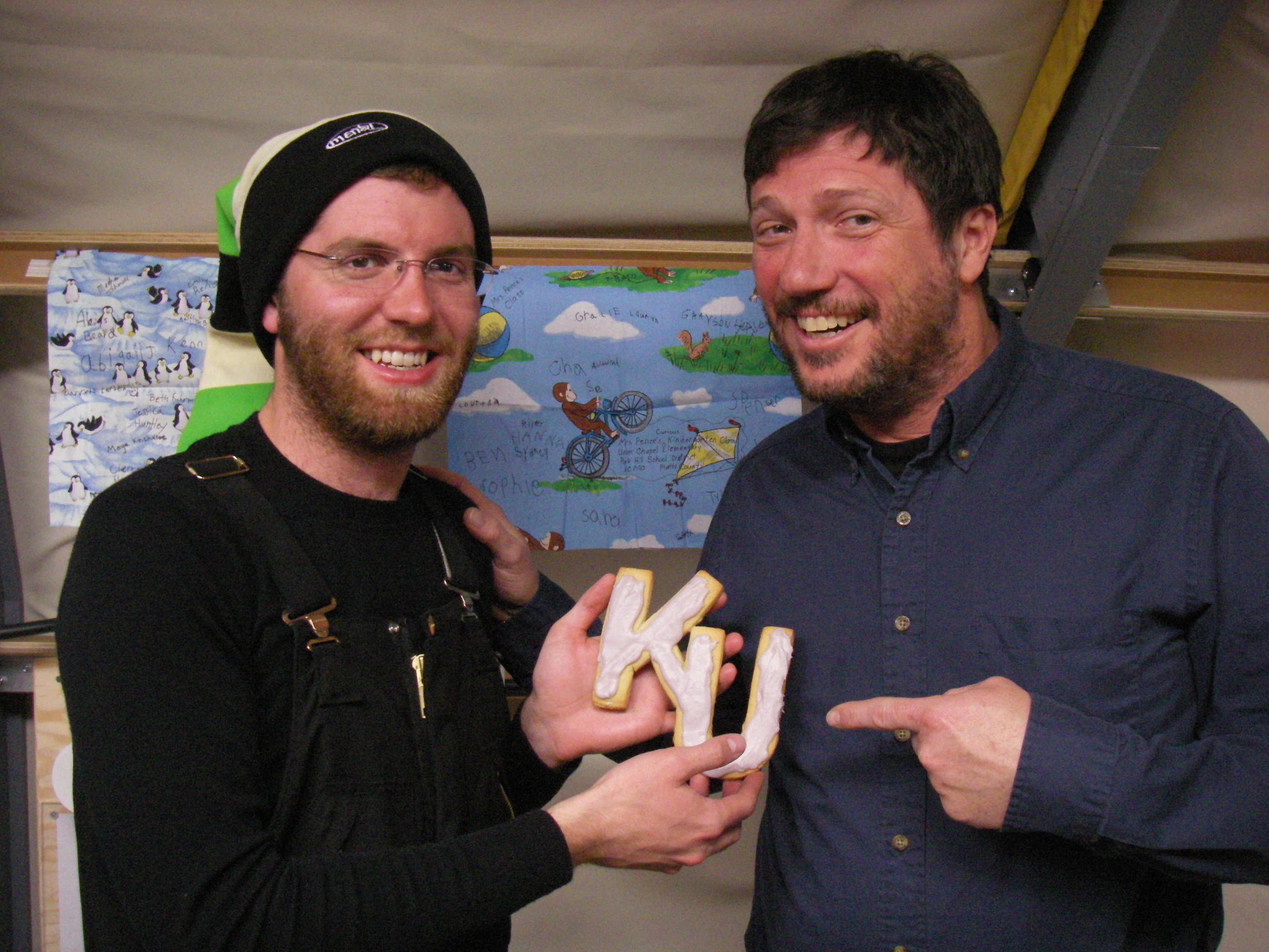 Cameron Lewis, University of Kansas, and Gary Wesche, Kansas State University, share a purple University of Kansas cookie. Byrd Surface Camp, Antarctica.