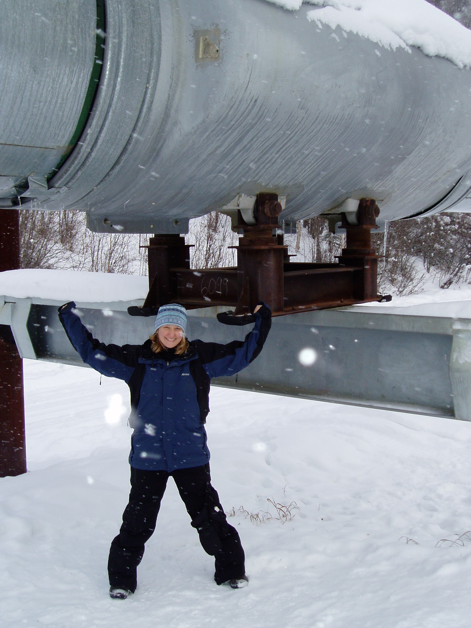 Lindsay Knippenberg poses underneath the Trans-Alaska Pipeline, which carries an average of 704,734 barrels of oil per day (as of 2009). Fox, Alaska.