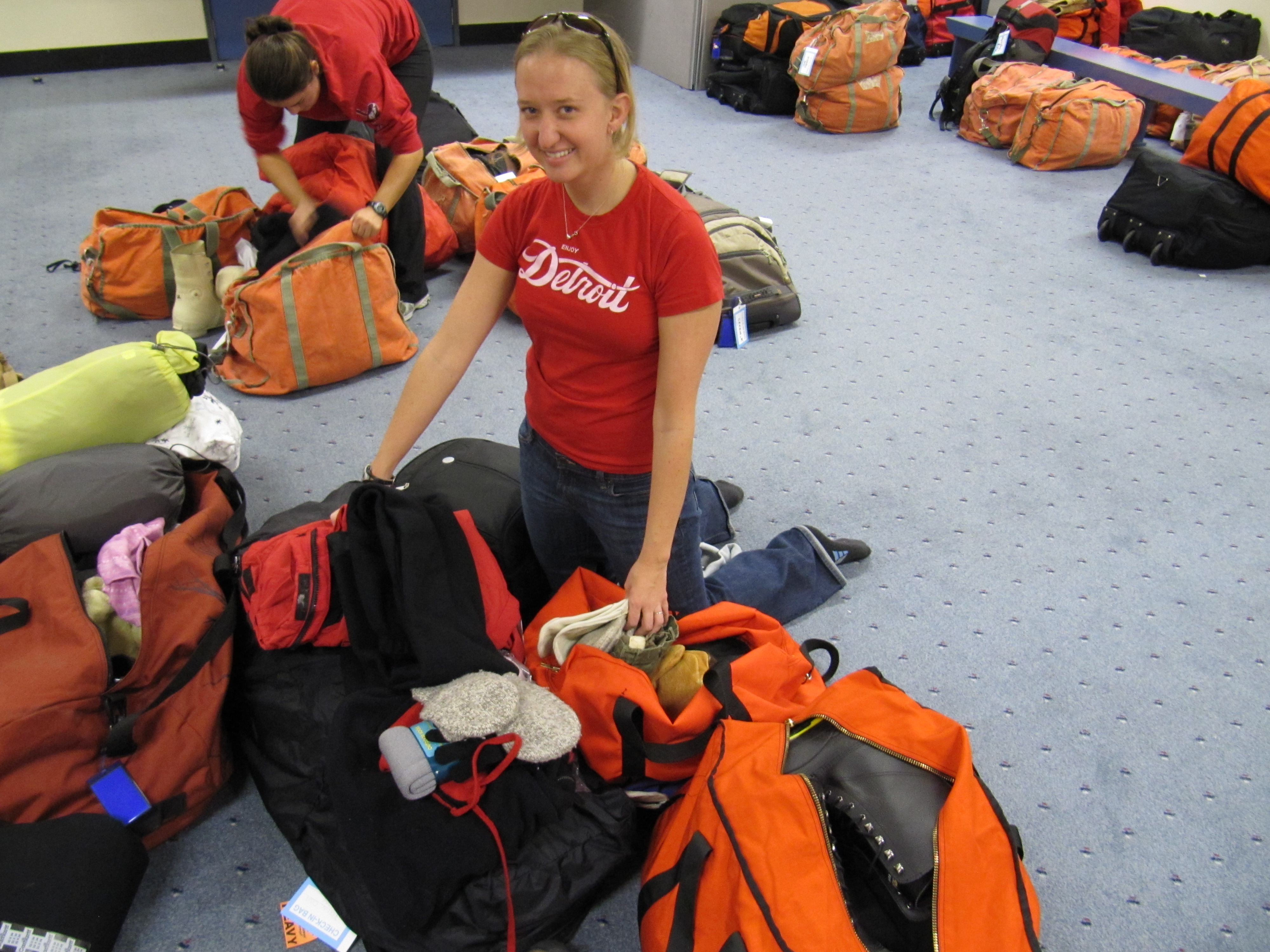 Lindsay Knippenberg: "Thinking and rethinking how to pack and organize my bags was quite the task." At the Clothing Distribution Center in Christchurch, New Zealand.