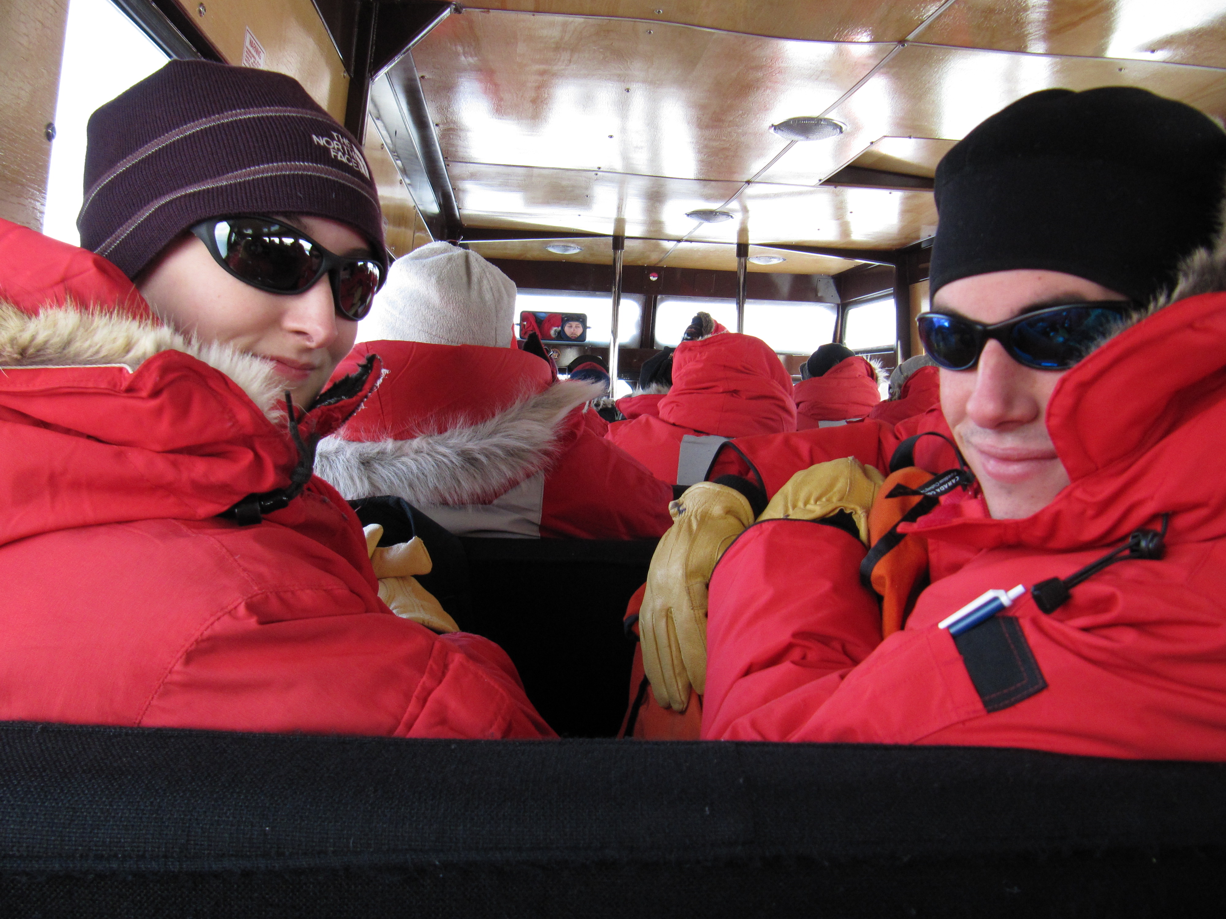 Shawn Doyle and Amanda Achberger enjoy their ride on "Ivan" the Terra Bus on the way to McMurdo Station, Antarctica.