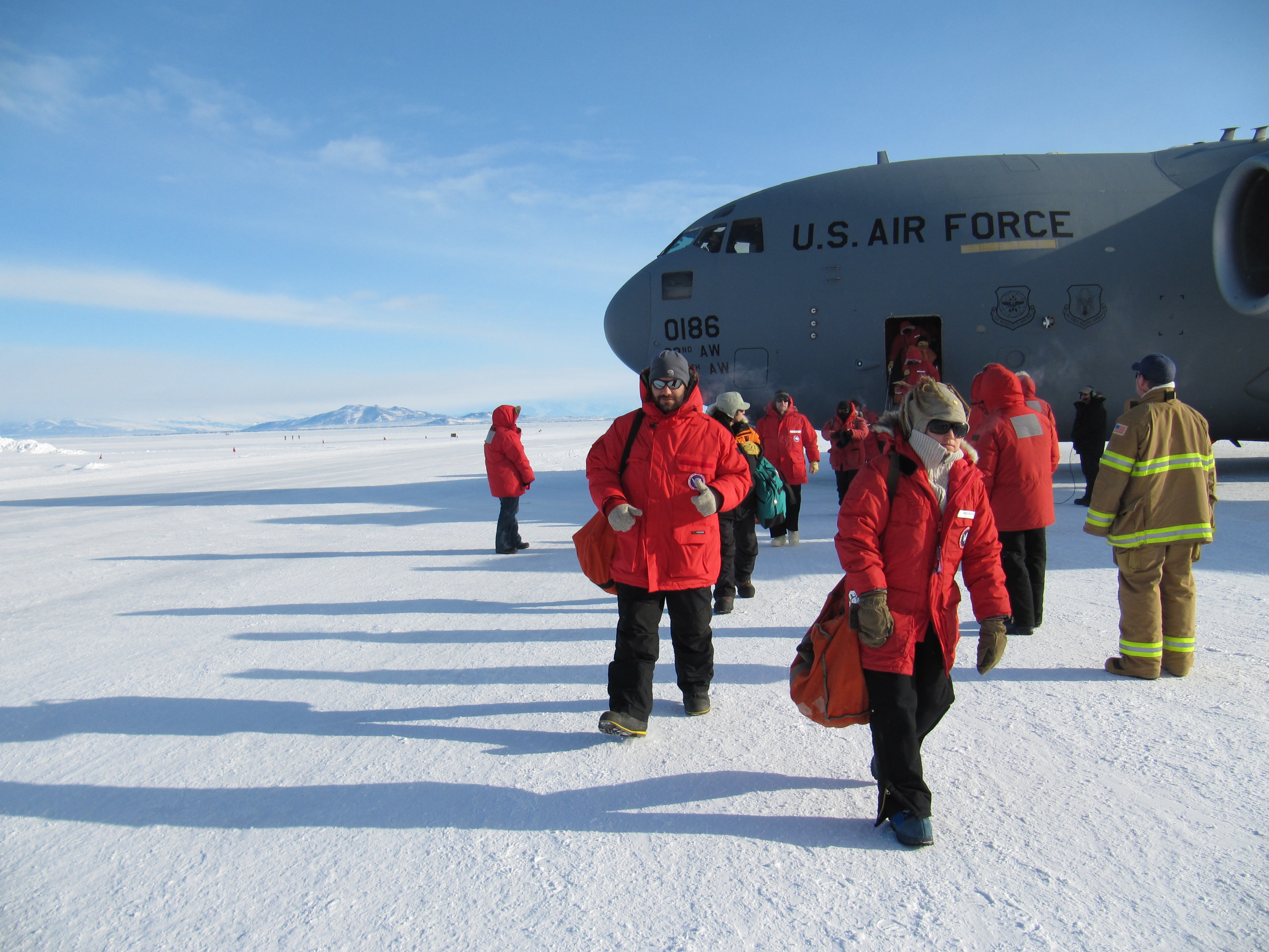 Scott Montross gets off of the plane and heads towards towards the "Ivan" the Terra Bus (the transport to McMurdo Station). Near McMurdo Station, Antarctica.