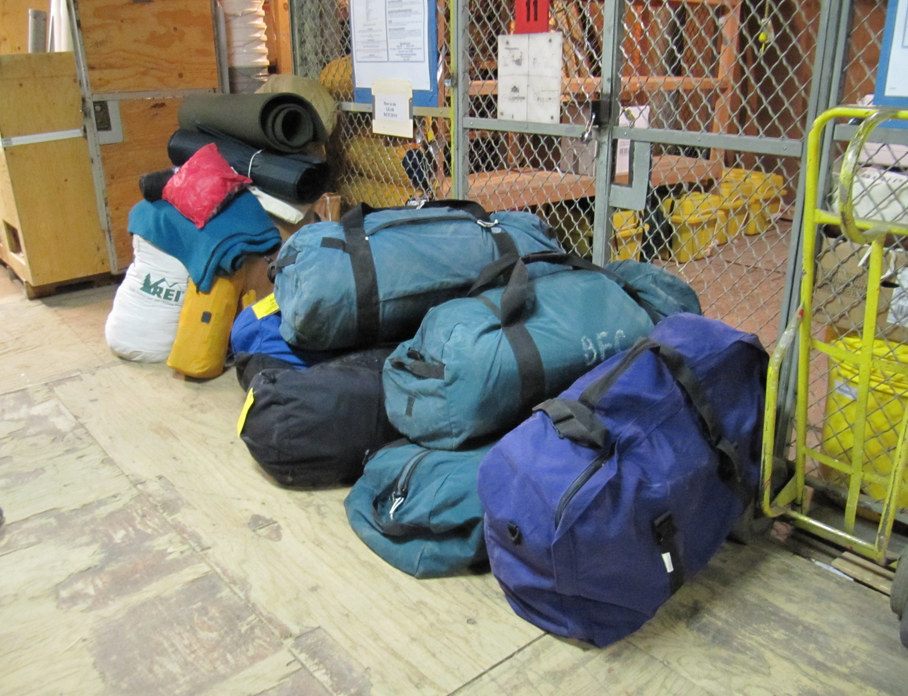 Lindsay Knippenberg: "After checking our tents, we placed our tent, sleeping bag, sleeping pads, and sleeping bag liner in big duffel bags." McMurdo Station, Antarctica.