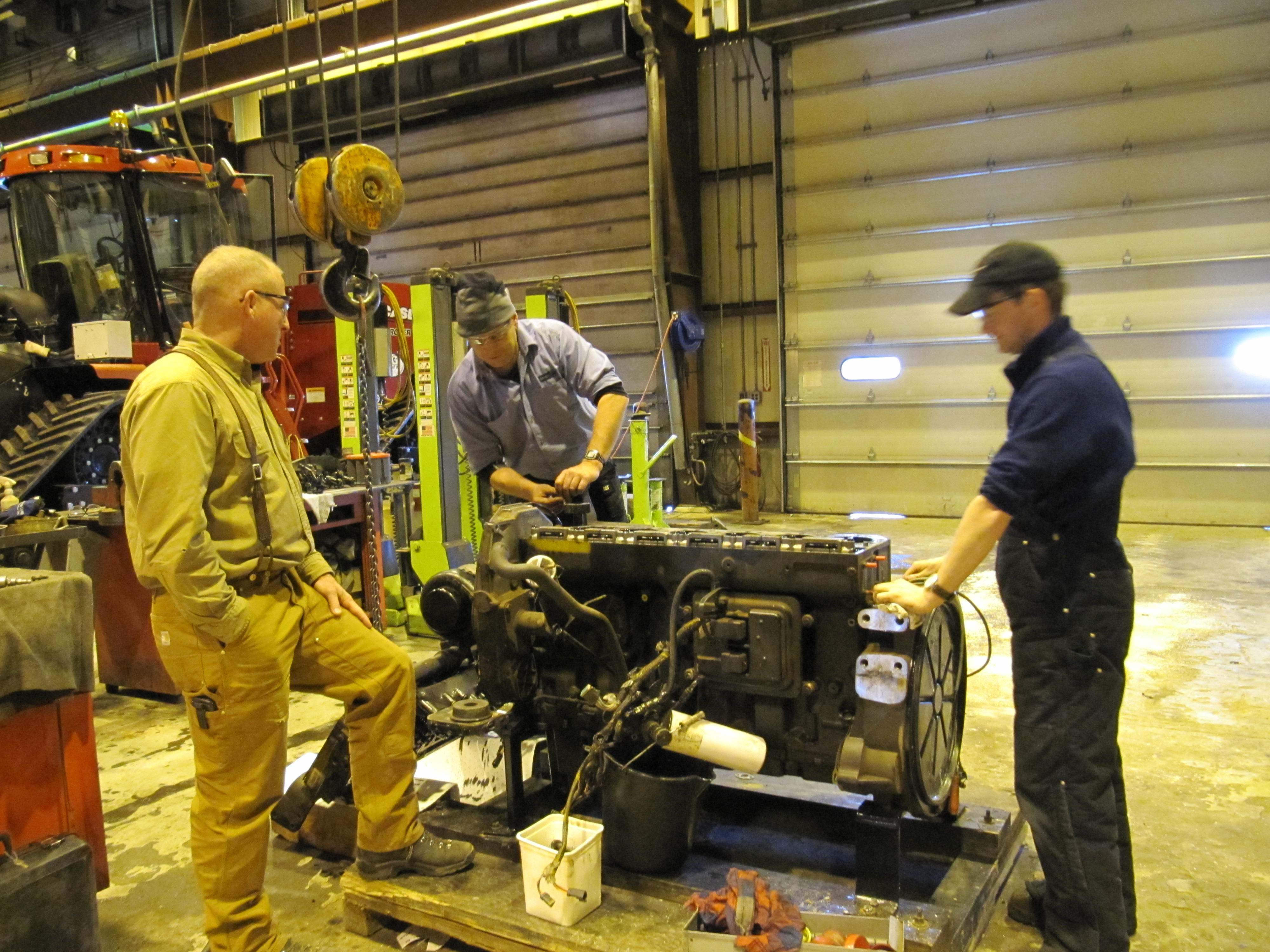 Three of the mechanics work on a very large engine. At the the heavy machine shop in McMurdo Station, Antarctica.