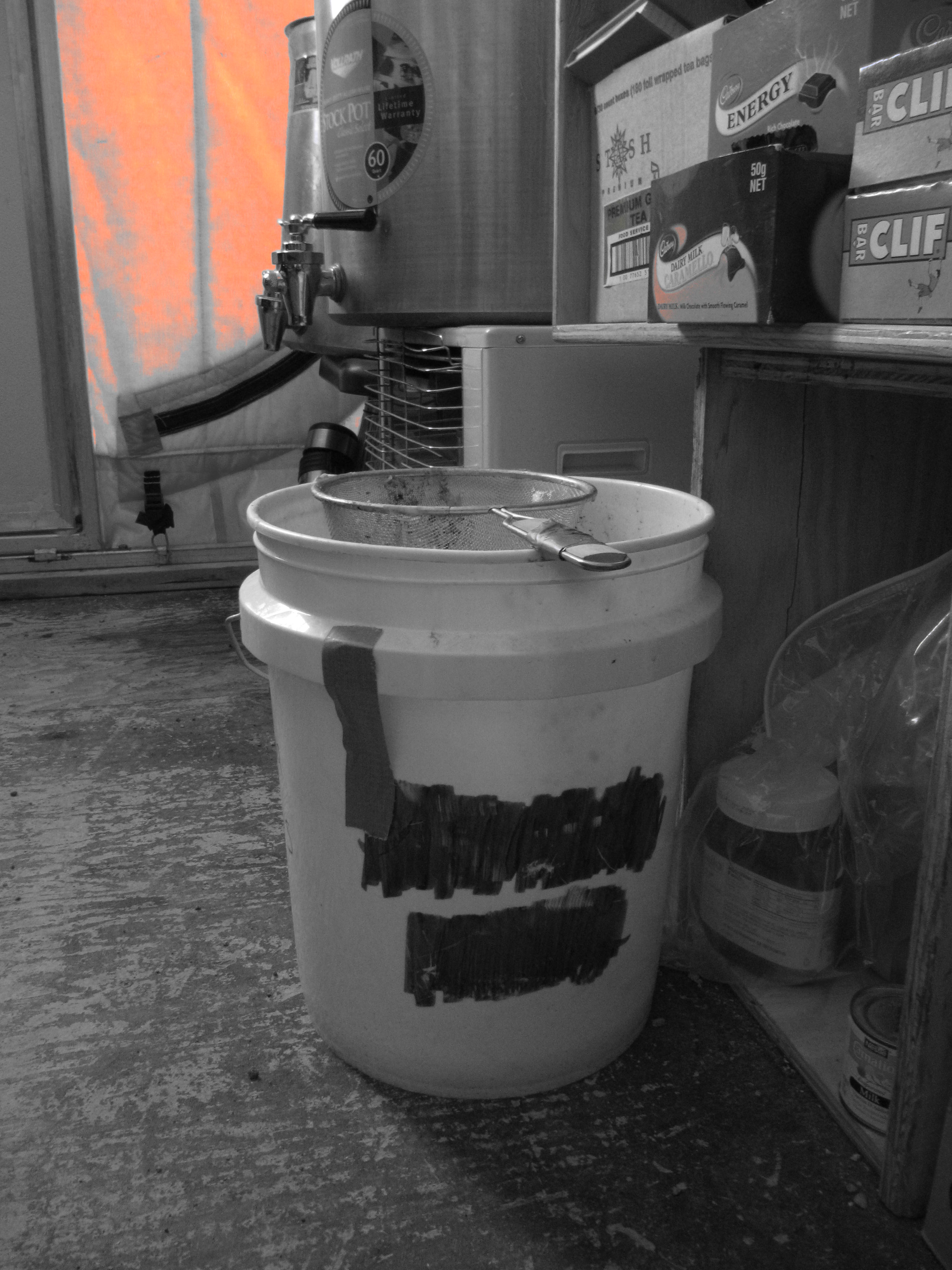 The grey water bucket in the kitchen tent is used for holding leftover water from cooking and washing dishes. McMurdo Dry Valleys, Antarctica.