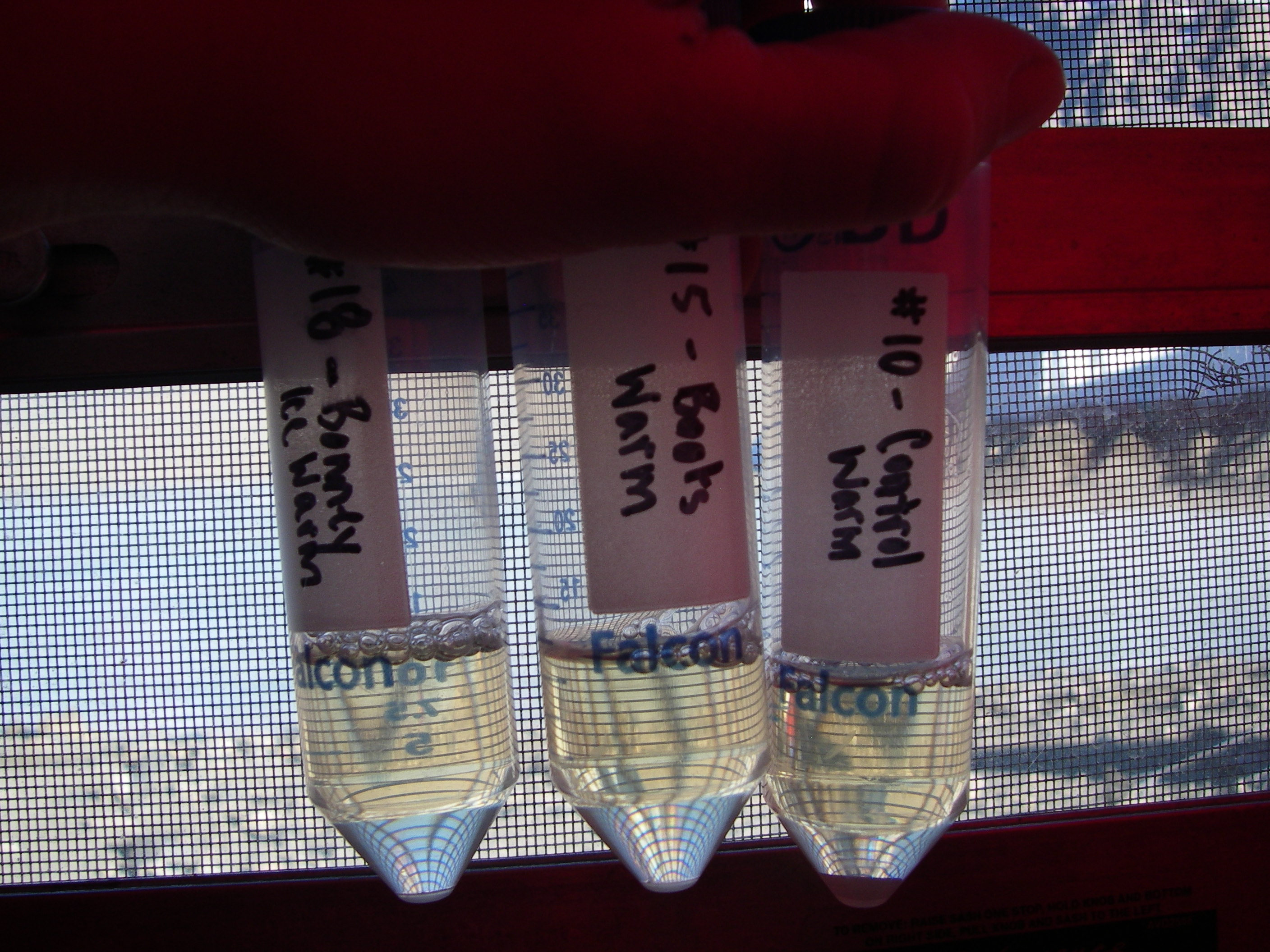 Lindsay Knippenberg: "After five days of growth, the only warm environment tubes to not grow any microorganisms are the control, Brent's boots, and ice from Lake Bonney. As for the cold environment, there isn't any growth in any of those tubes yet." McMurdo Dry Valleys, Antarctica.
