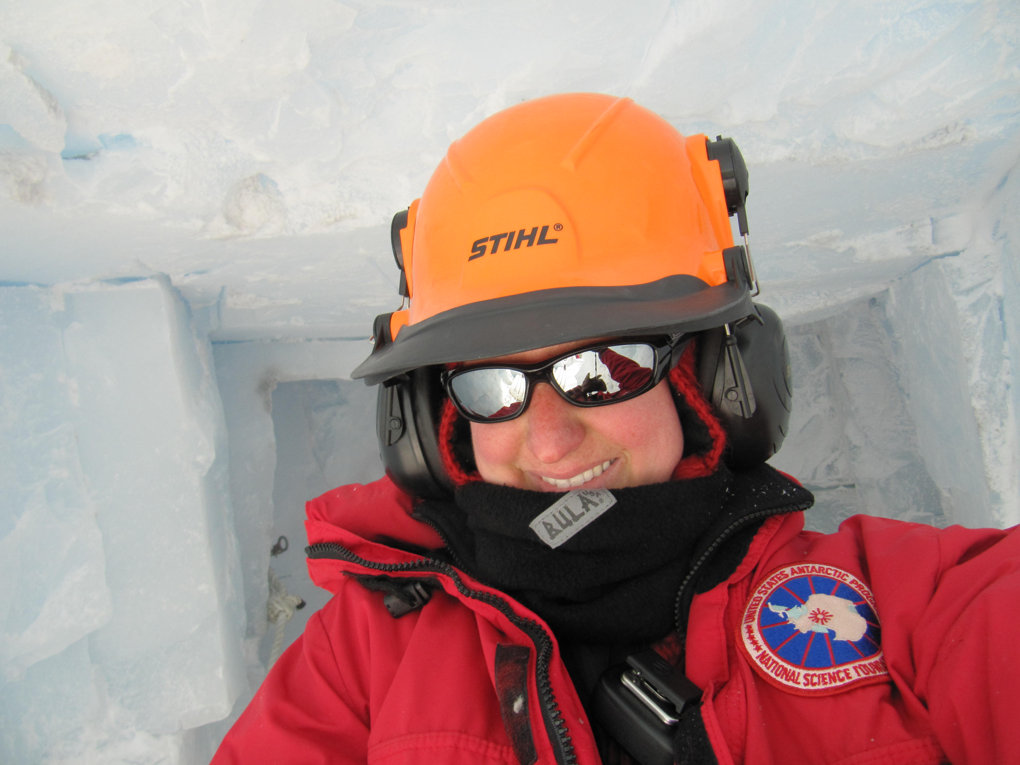Lindsay Knippenberg takes a break in the tunnel before getting back to work again. At Taylor Glacier in the McMurdo Dry Valleys, Antarctica.