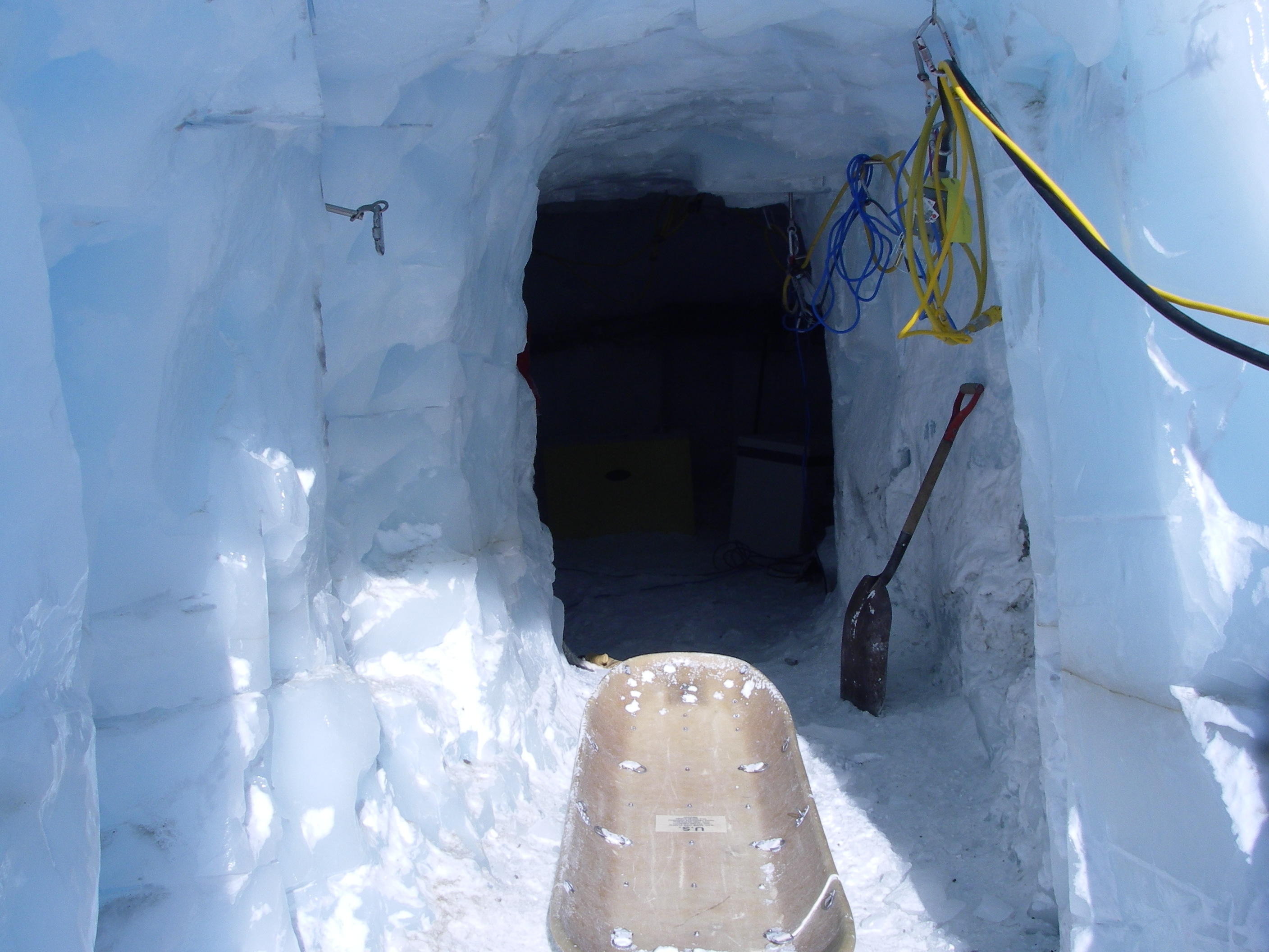 A view looking down the finished tunnel. It is about nine meters deep and by the time the team is finished sampling it should be about ten meters deep. At Taylor Glacier in the McMurdo Dry Valleys, Antarctica.