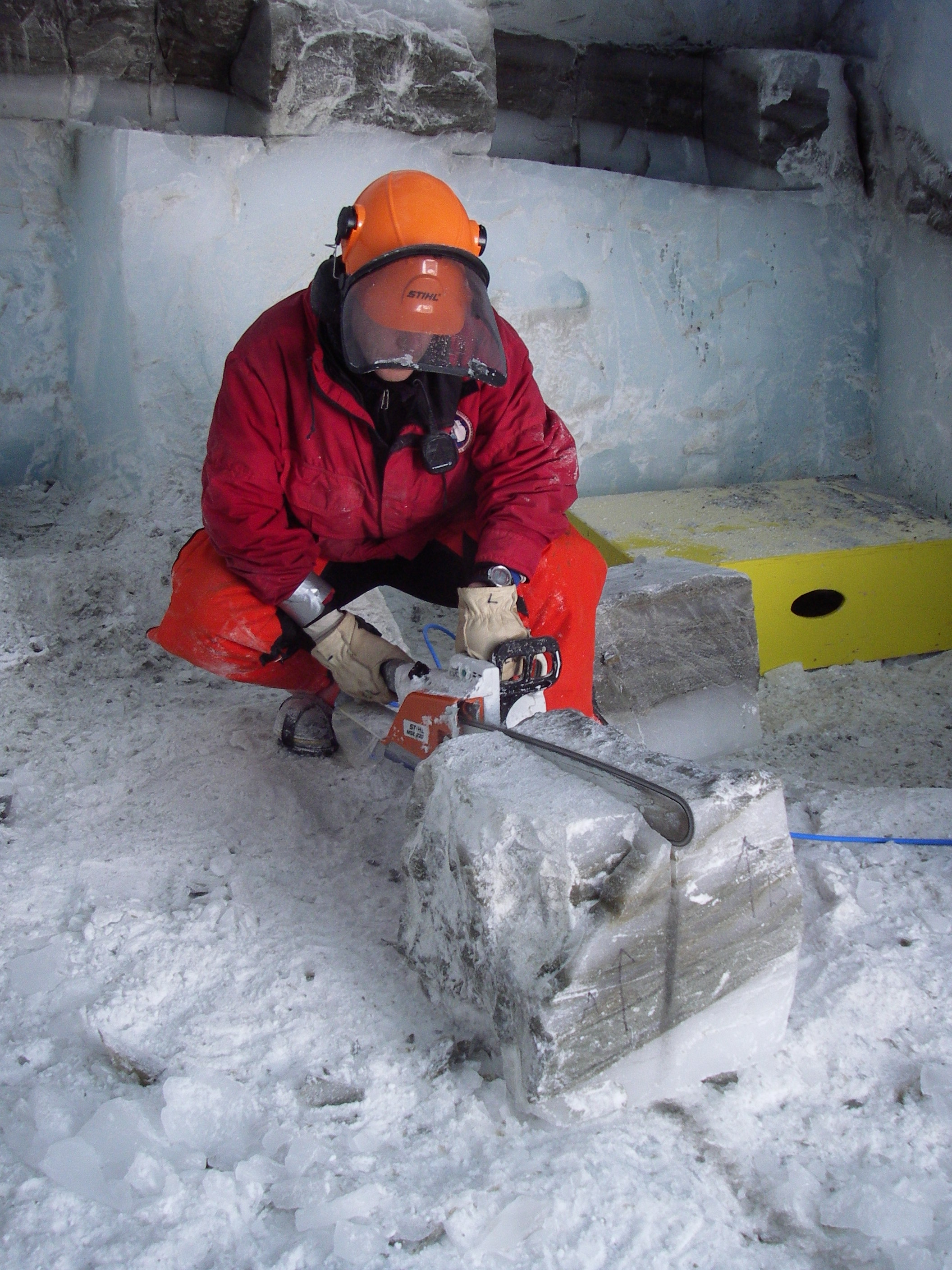 After making sure that he cuts it in the correct position, Brent Christner cuts the ice block in the middle to get the A and the B side. One half will go to the Montana State team and the other half will go to the Louisiana State team. At Taylor Glacier in the McMurdo Dry Valleys, Antarctica.