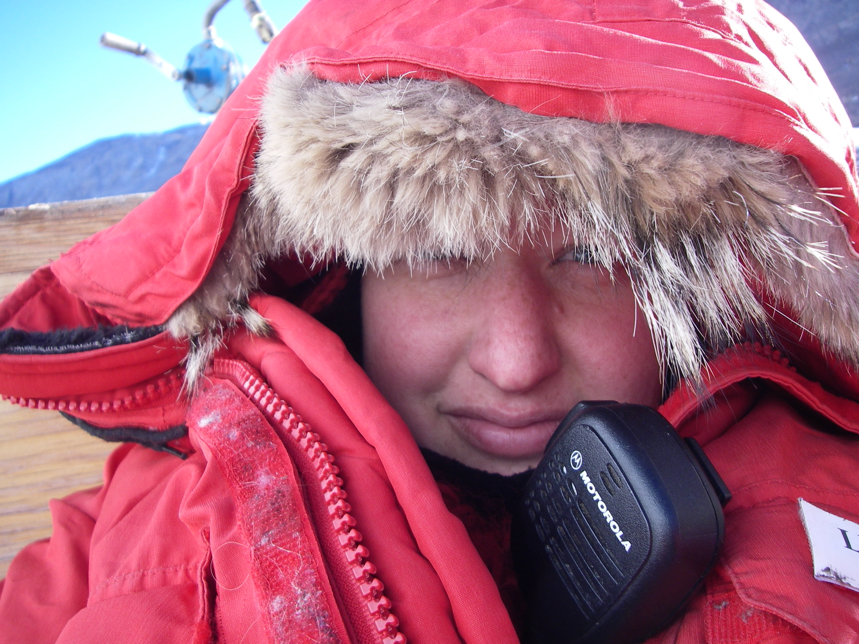 Lindsay Knippenberg: "My 'big red' keeps me warm and protects me from the wind while I am on watch." At Taylor Glacier in the McMurdo Dry Valleys, Antarctica.