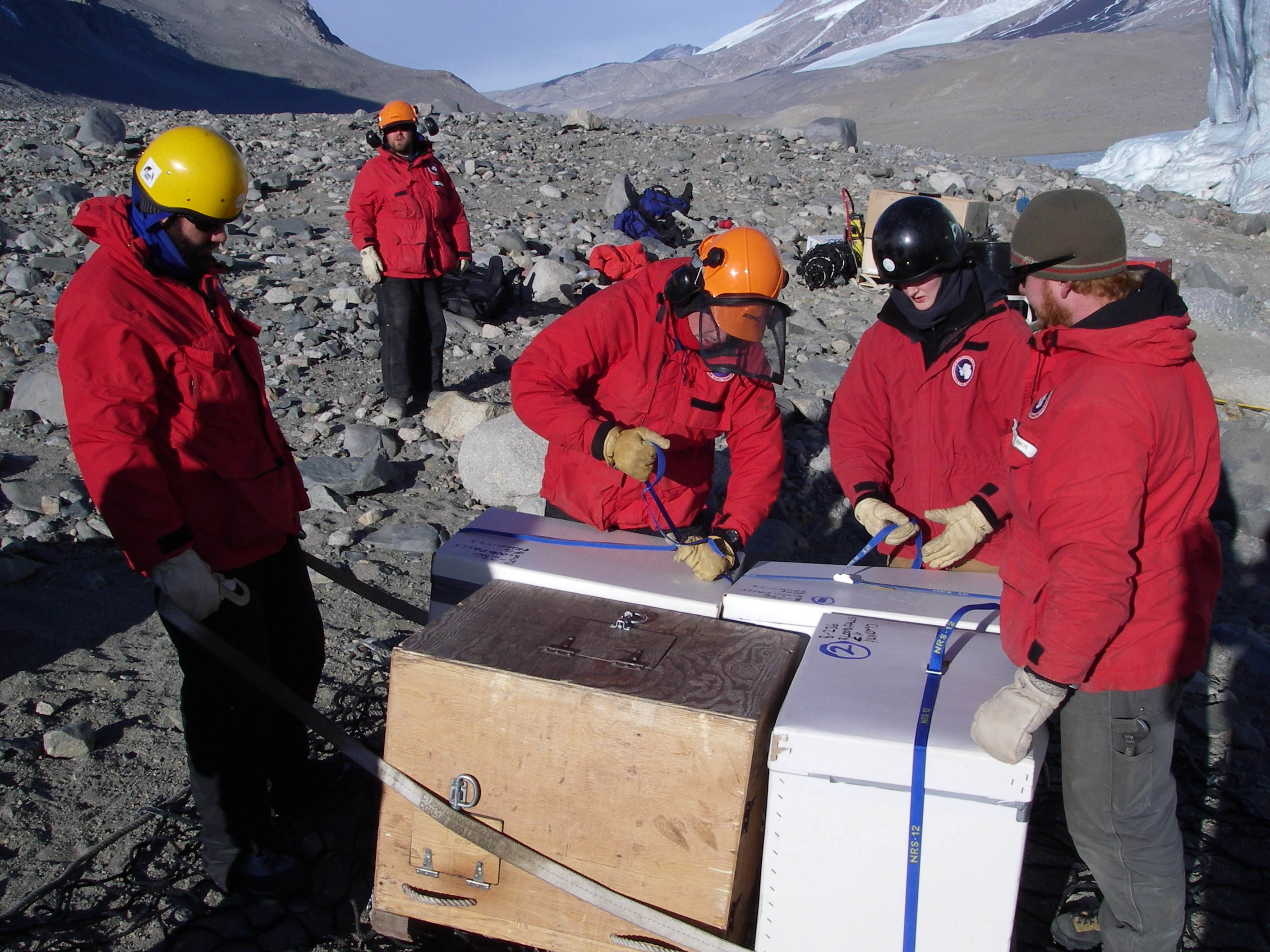 The lids must be tied down and the freeze safes are strapped together before they can be flown out. At Taylor Glacier in the McMurdo Dry Valleys, Antarctica.