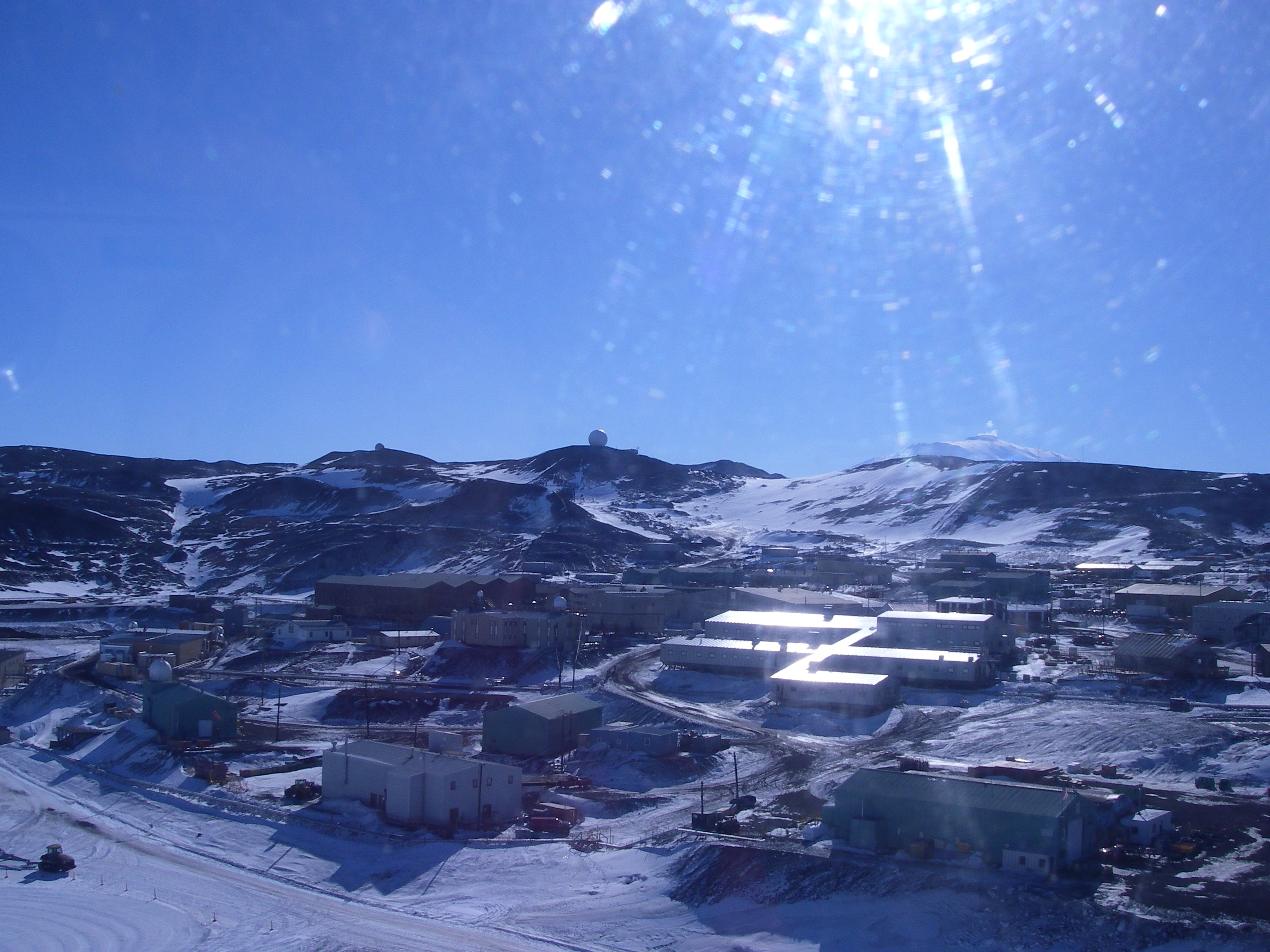 Lindsay Knippenberg: "After a beautiful helicopter flight, we flew across the sound and could see McMurdo Station again." McMurdo Station, Antarctica.