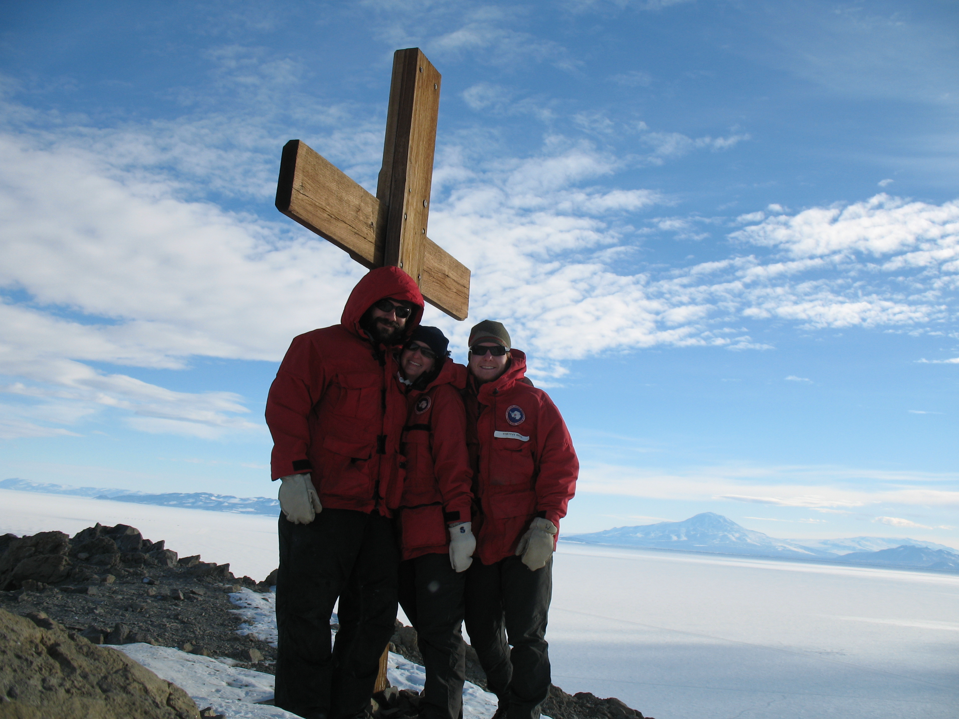 Scott Montross, Tim Brox, and Lindsay Knippenberg pose for a photo at the top of Observation Hill before hiking back down. McMurdo Station, Antarctica.