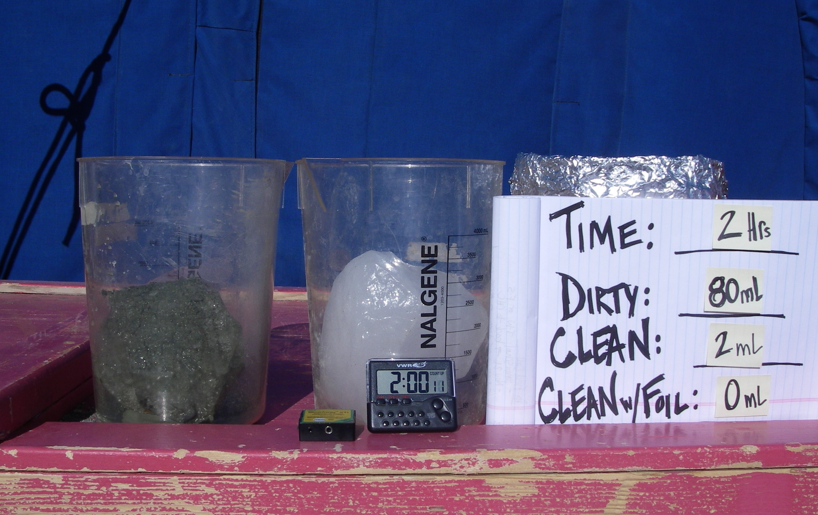 After two hours the dirty ice created 80mL of melt water, the clean ice created 2mL of melt water, and the clean ice with foil created 0mL of melt water. McMurdo Dry Valleys, Antarctica.