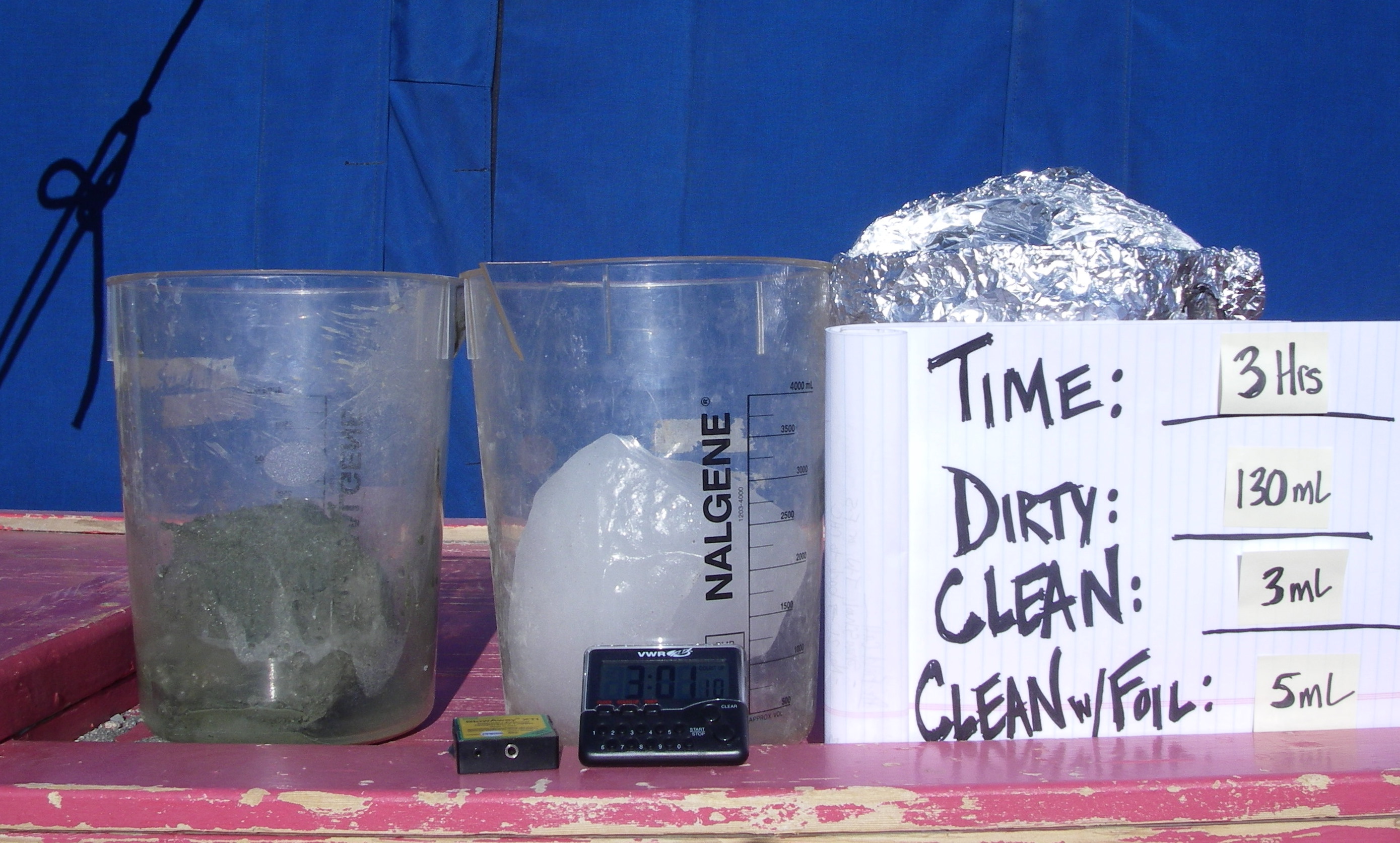 After three hours the dirty ice created 130mL of melt water, the clean ice created 3mL of melt water, and the clean ice with foil created 5mL of melt water. McMurdo Dry Valleys, Antarctica.