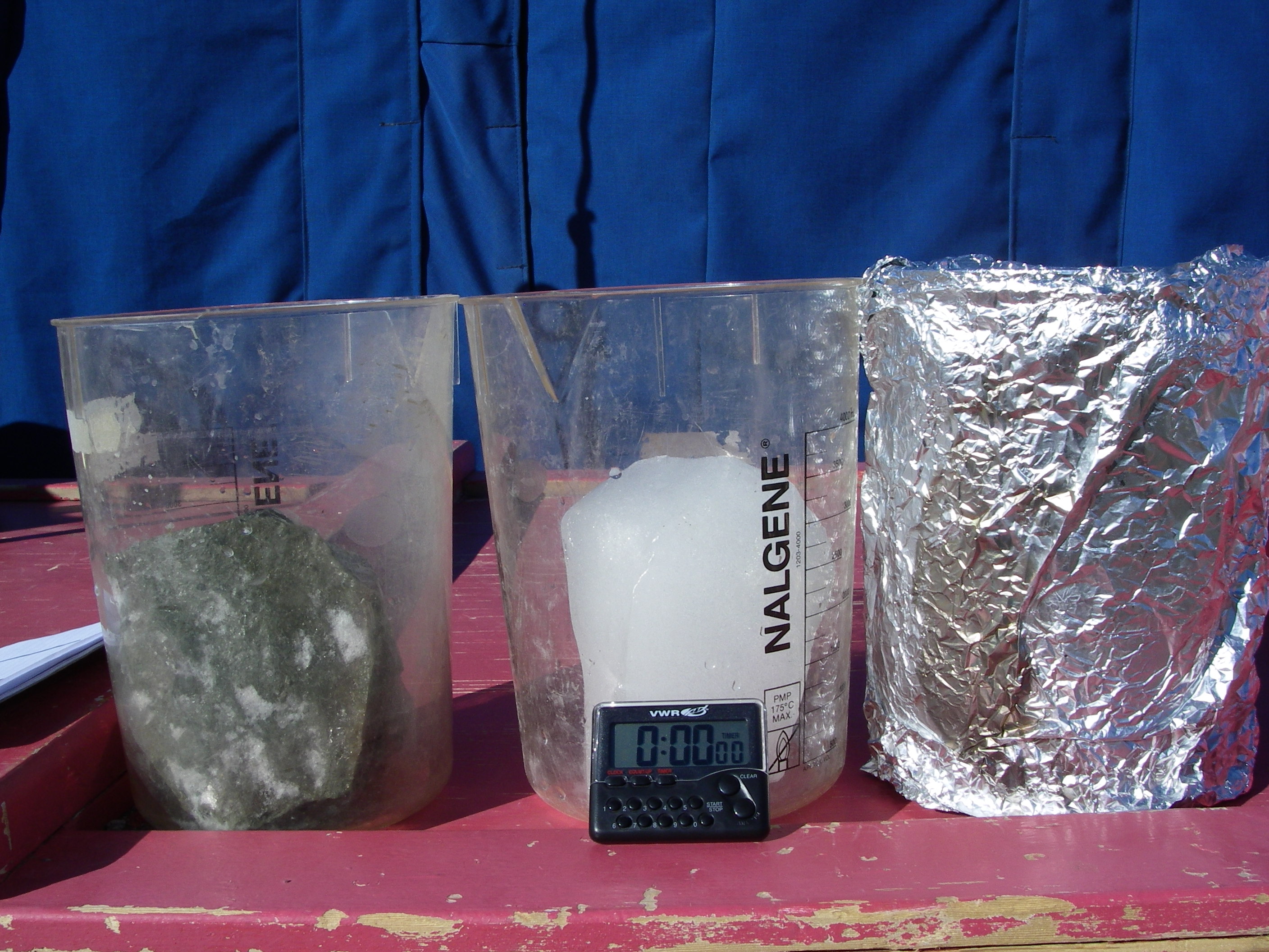 This is an experiment to see which ice will melt and create the most melt water. The dirty ice is on the left, the clean ice is in the middle, and the clean ice with foil is on the right. McMurdo Dry Valleys, Antarctica.