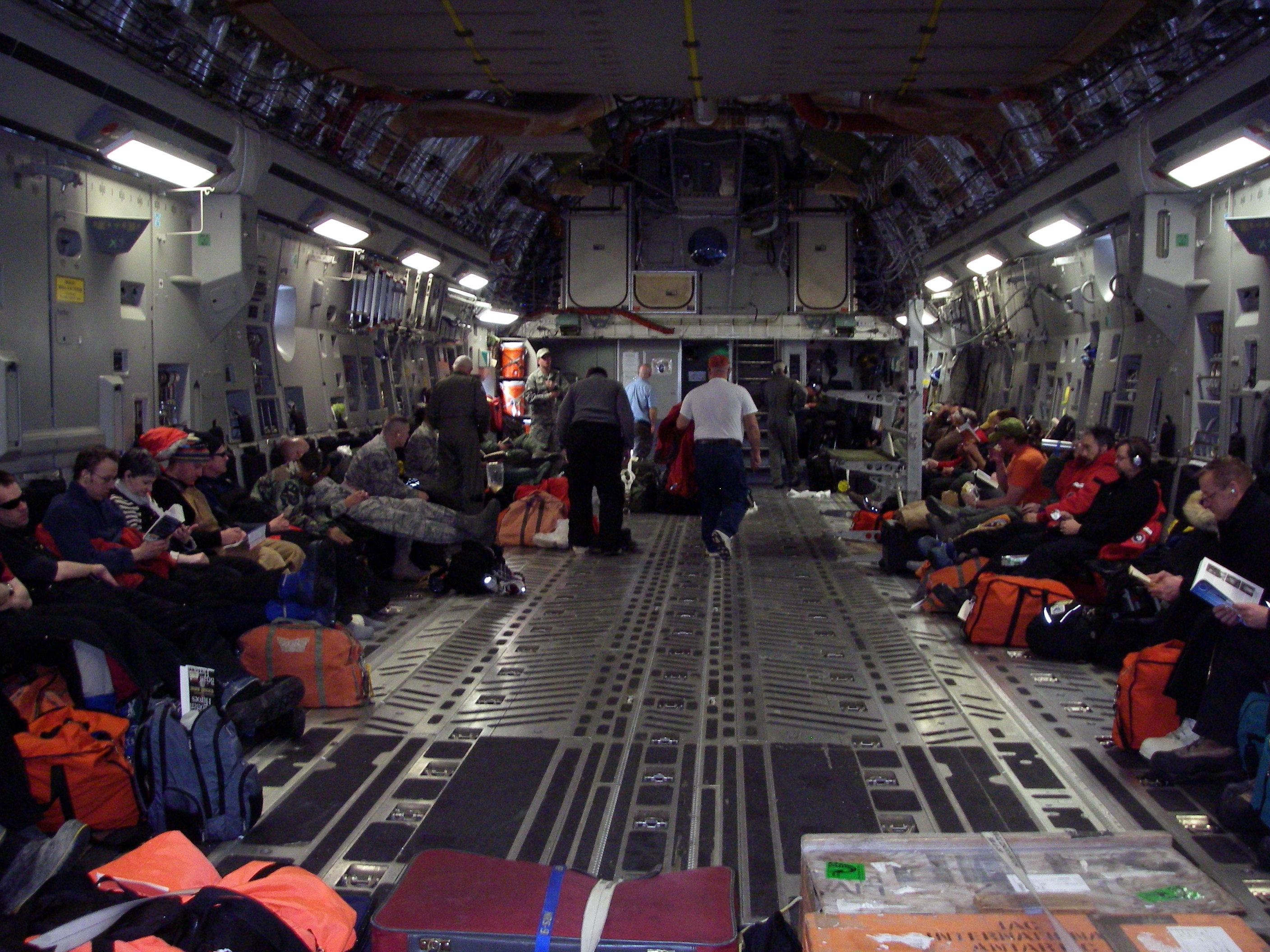 Lindsay Knippenberg: "There wasn't too many people on my flight back to Christchurch, so we had lots of room for our legs and we got to walk around." McMurdo Station, Antarctica.