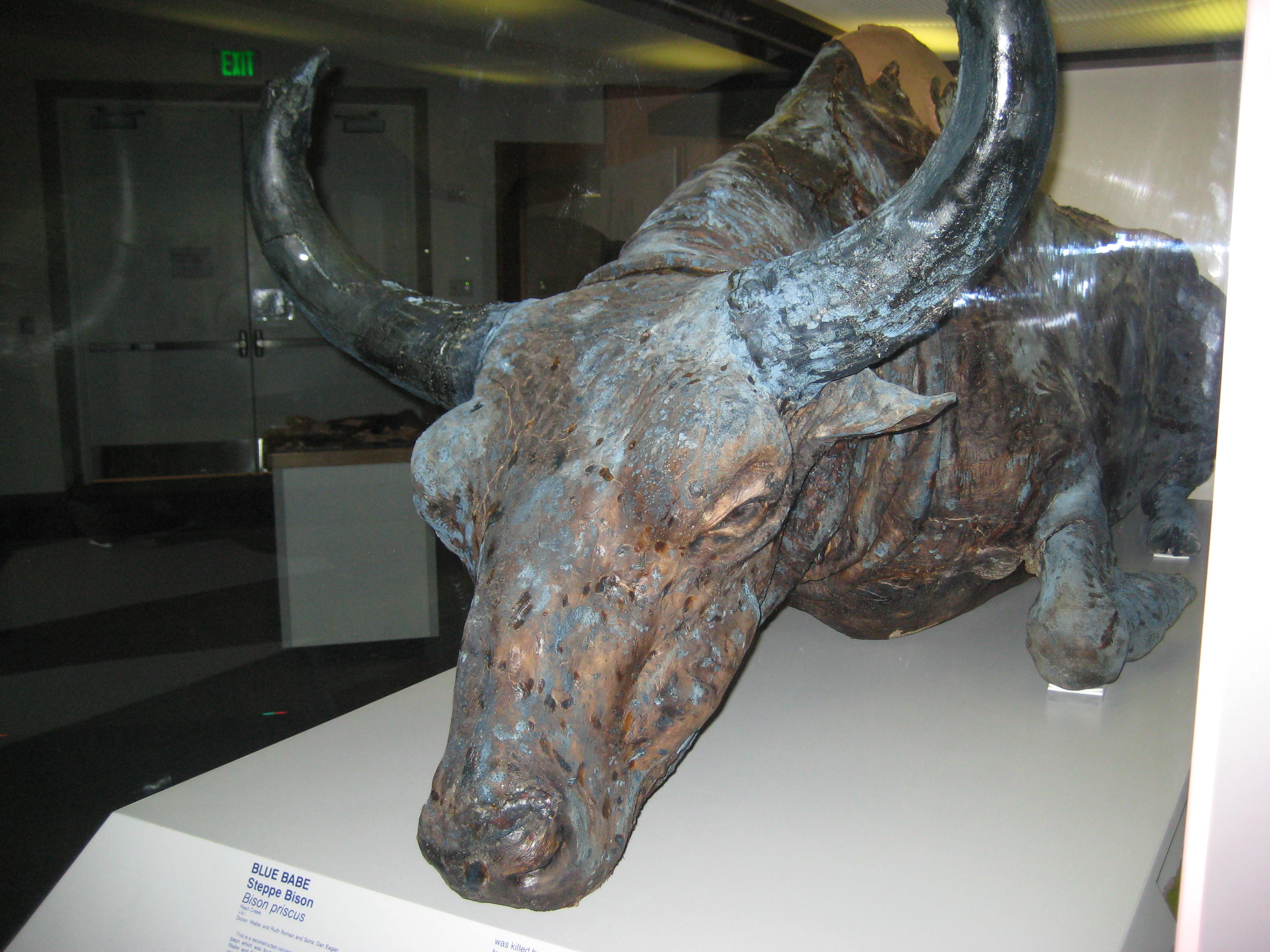 Michael Wing: "This is an extinct steppe bison from the Pleistocene. He was killed by a lion but was frozen into the permafrost before the lion finished eating him. Minerals in the soil stained his hide." At the University of Alaska Museum of the North in Fairbanks, Alaska.