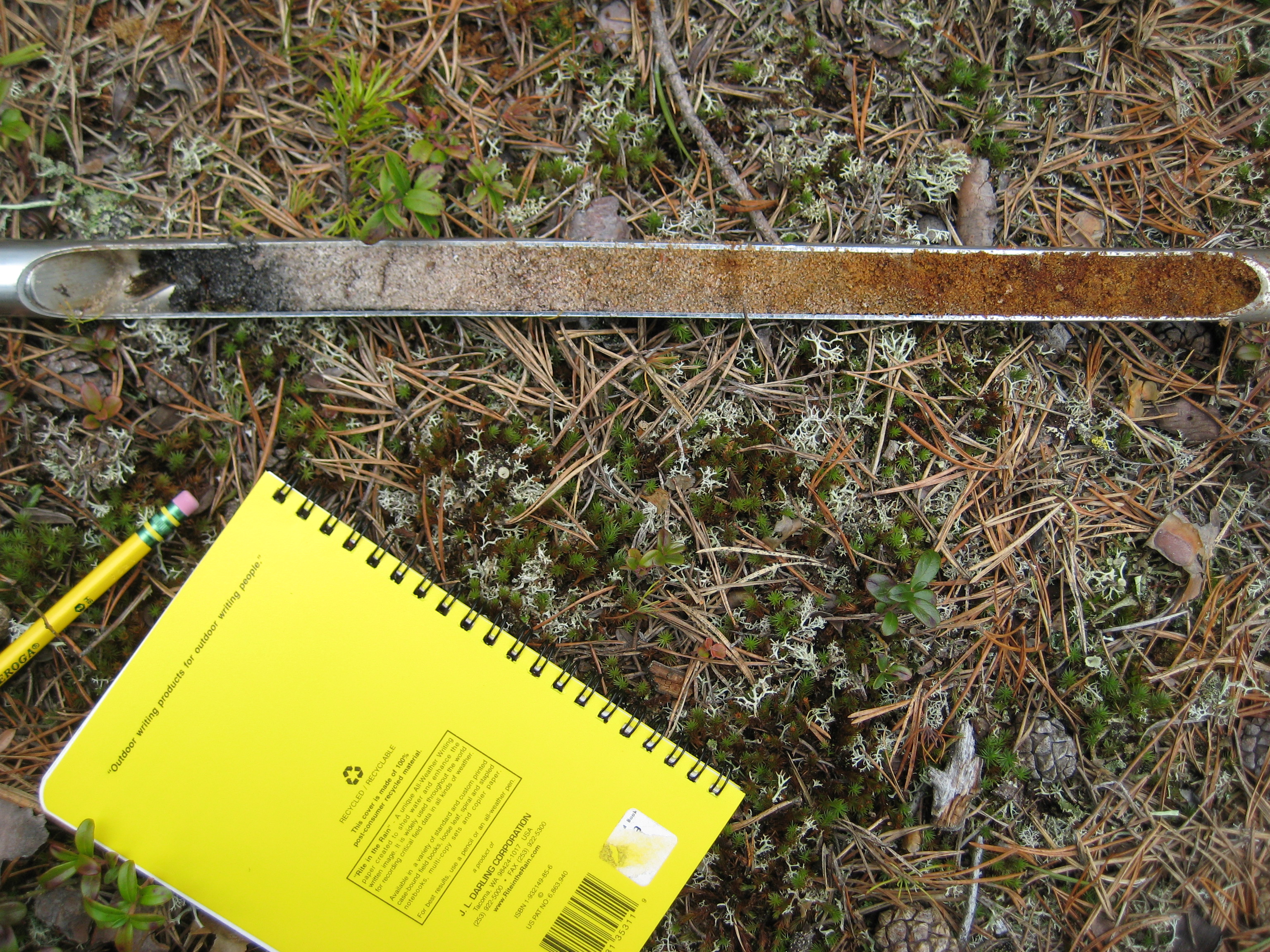 Michael Wing: "The dark band is about an inch of organic matter on the top - then comes almost pure beach sand. Leached iron oxide stains the lower portion reddish brown." At the excavation site near Yli-Ii, Finland.
