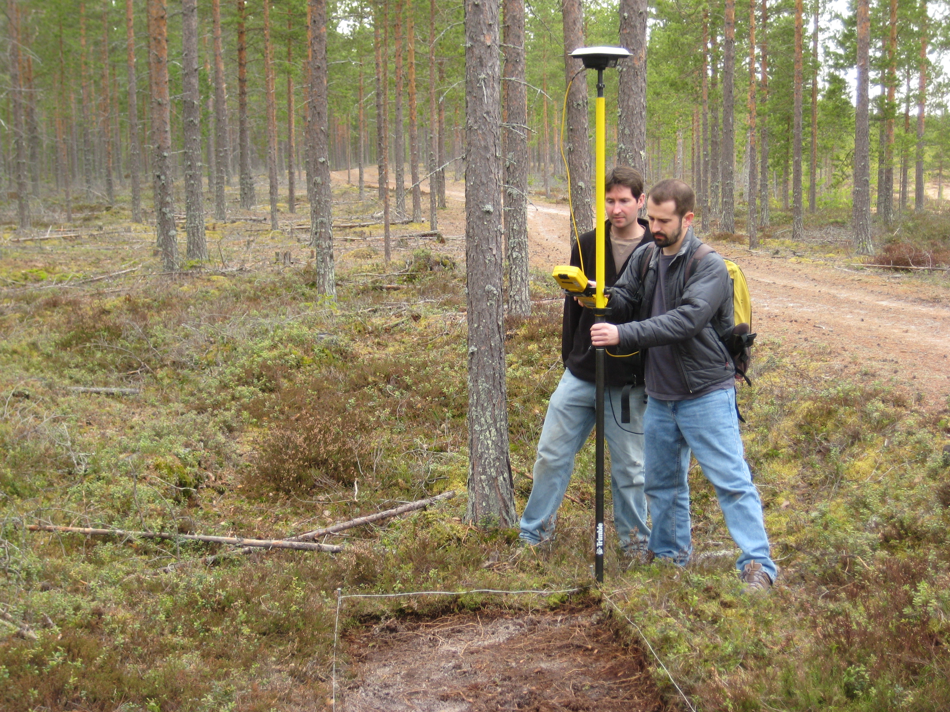 Greg Korosec and Dustin Keeler use the GPS rover. It locates the corners of the rectangle to within a centimeter. At the excavation site near Yli-Ii, Finland.