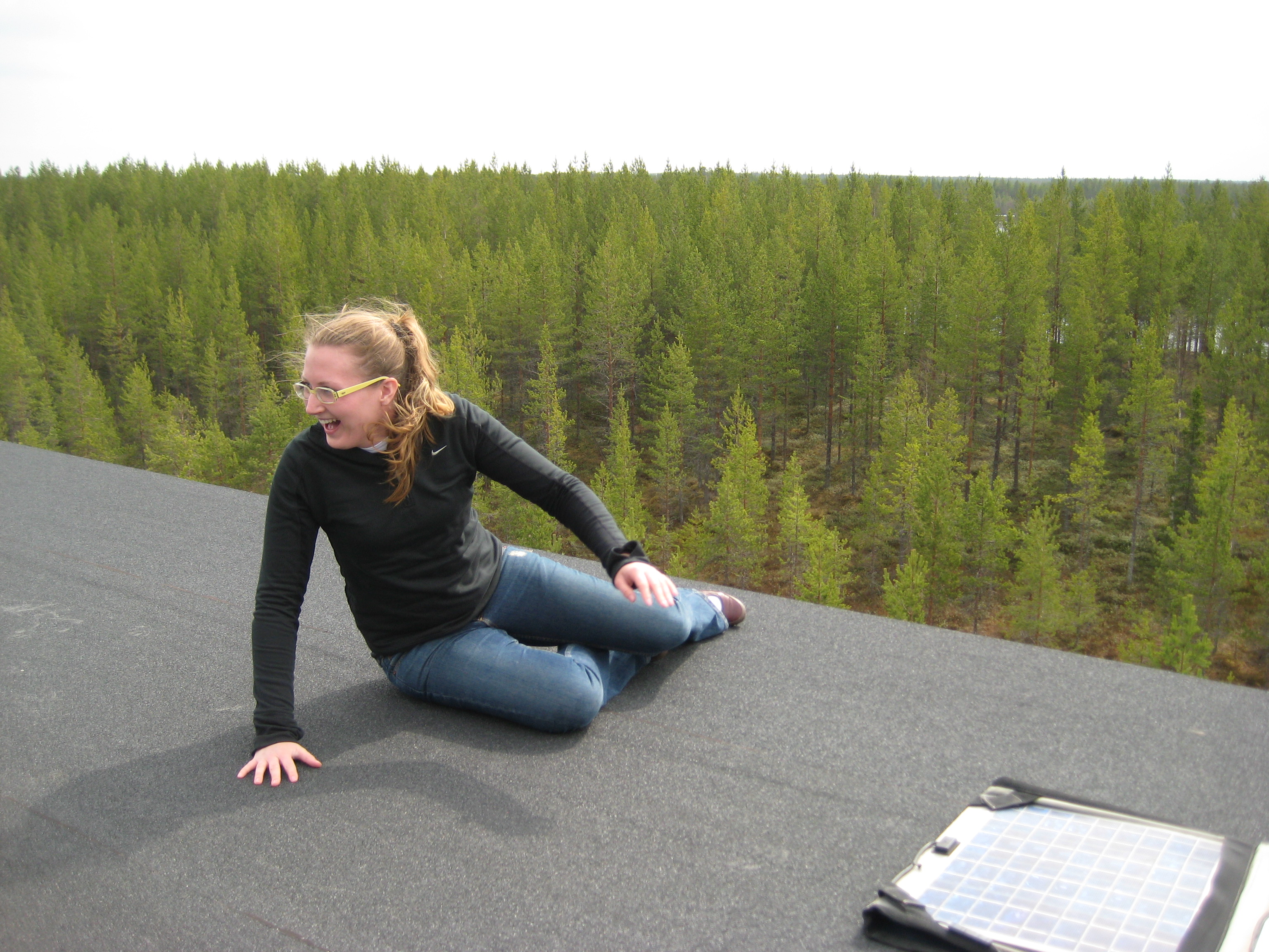 Sarah Billiar on the roof of the Kierikki Stone Age Centre near Yli-Ii, Finland.