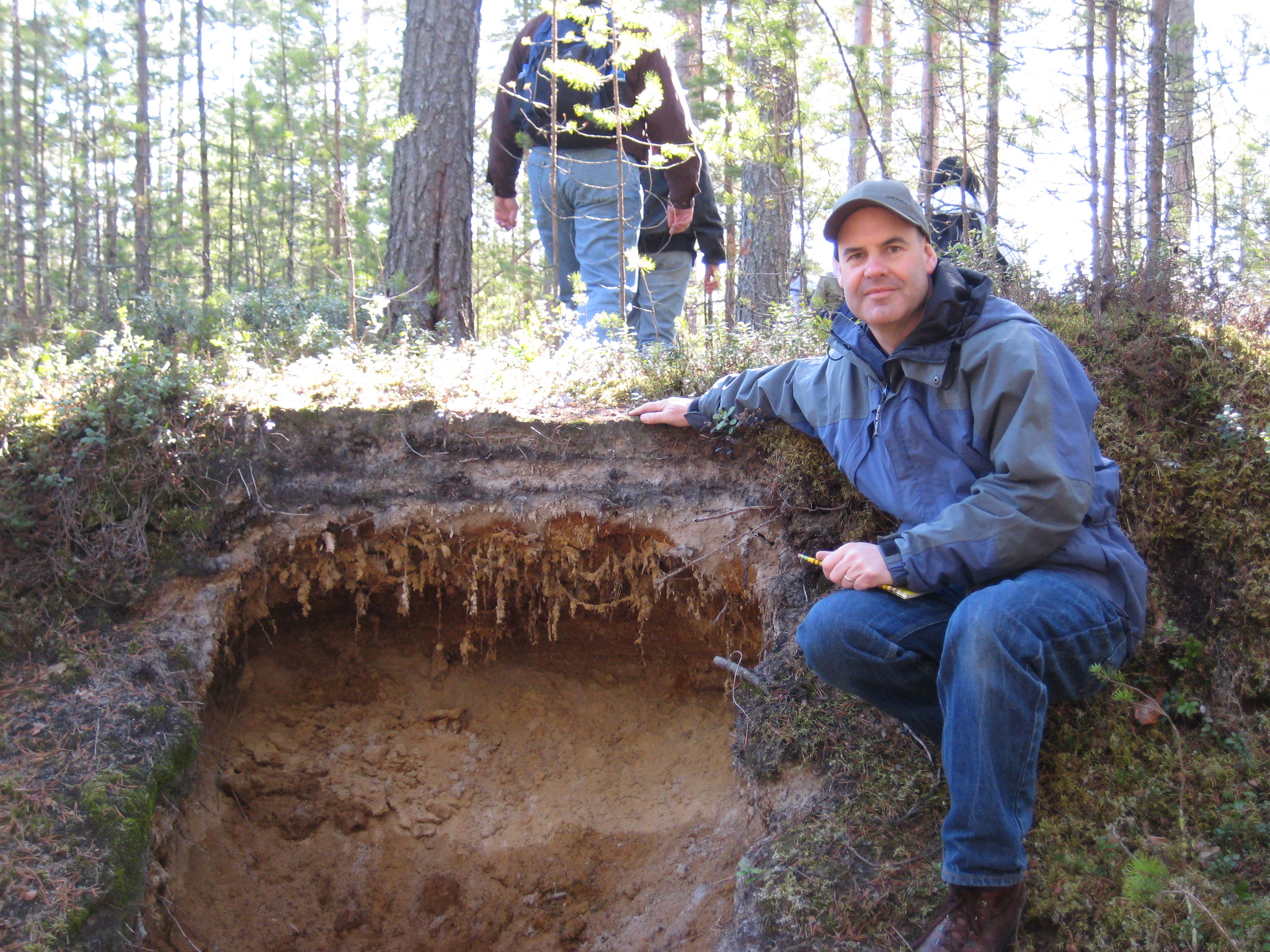 Michael Wing poses in front of "The Thing" earthworks cut. He adds, "You can clearly see two ancient 'A' horizons in the soil." At the excavation site near Yli-Ii, Finland.