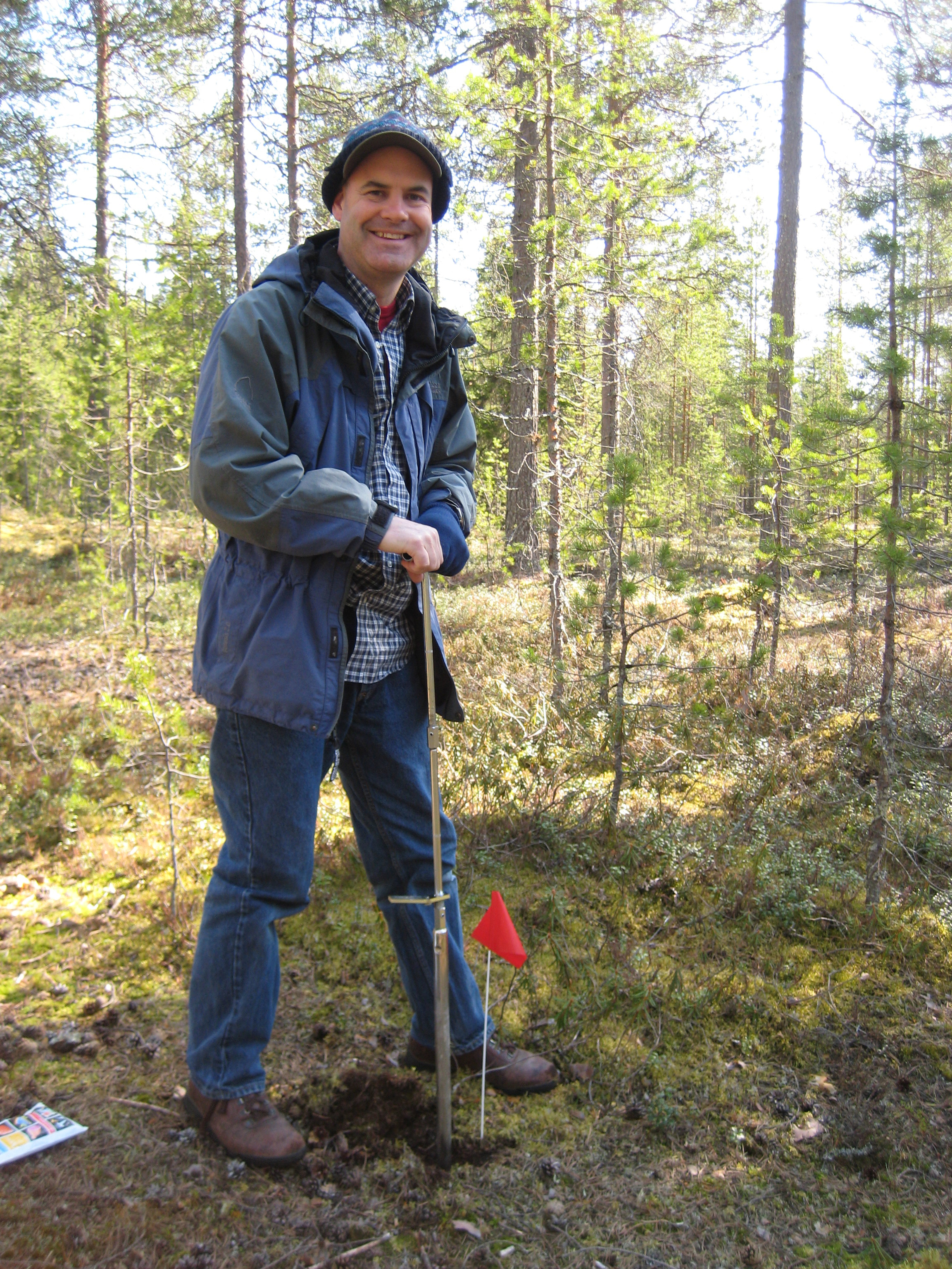 Michael Wing takes a soil sample at "Moose Village". At the excavation site near Yli-Ii, Finland.