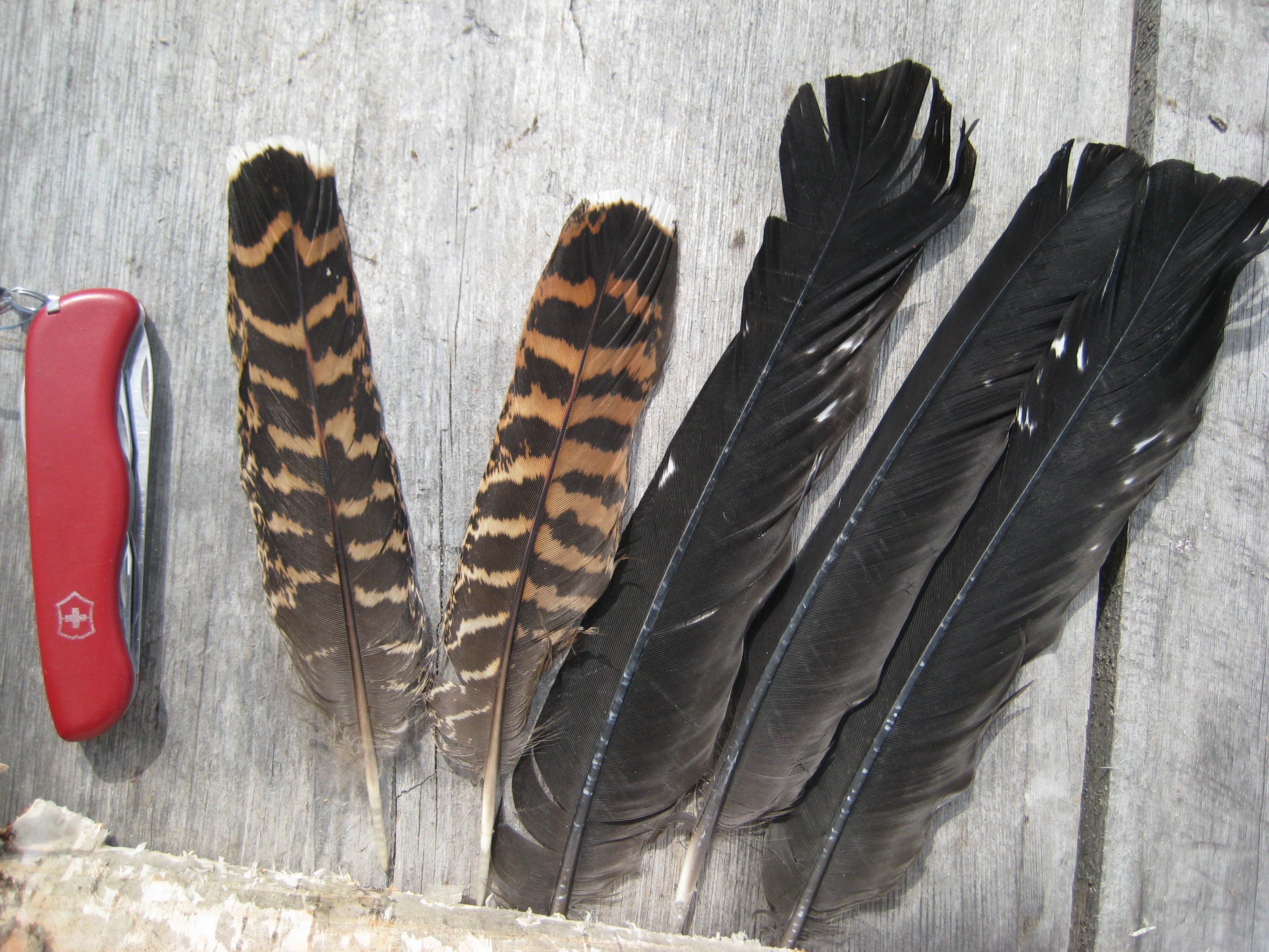Assorted feathers found in the woods (not all from the same bird). Finnish Woods, Finland.