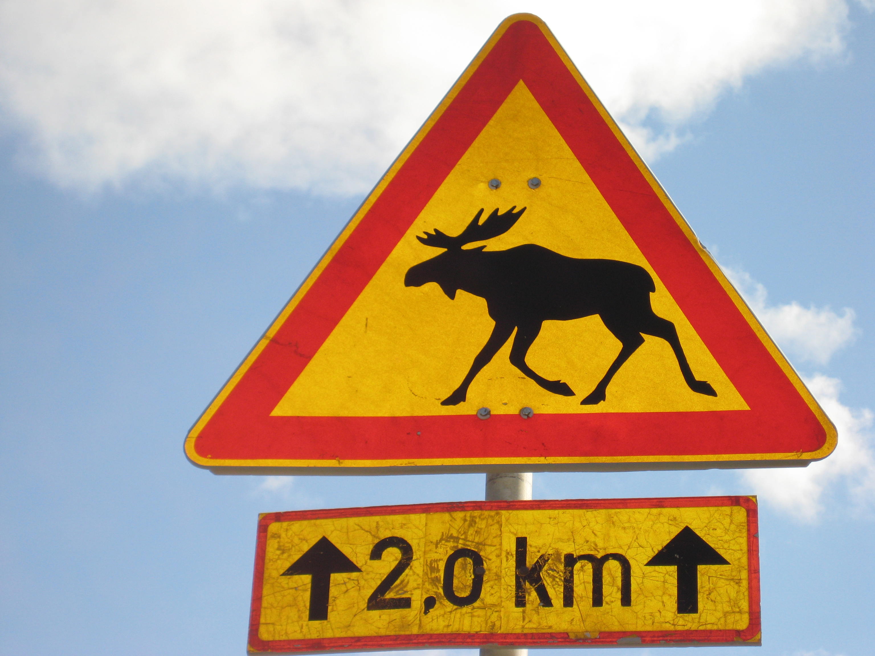 A moose crossing sign on the road between Oulu and Rovaniemi, Finland.