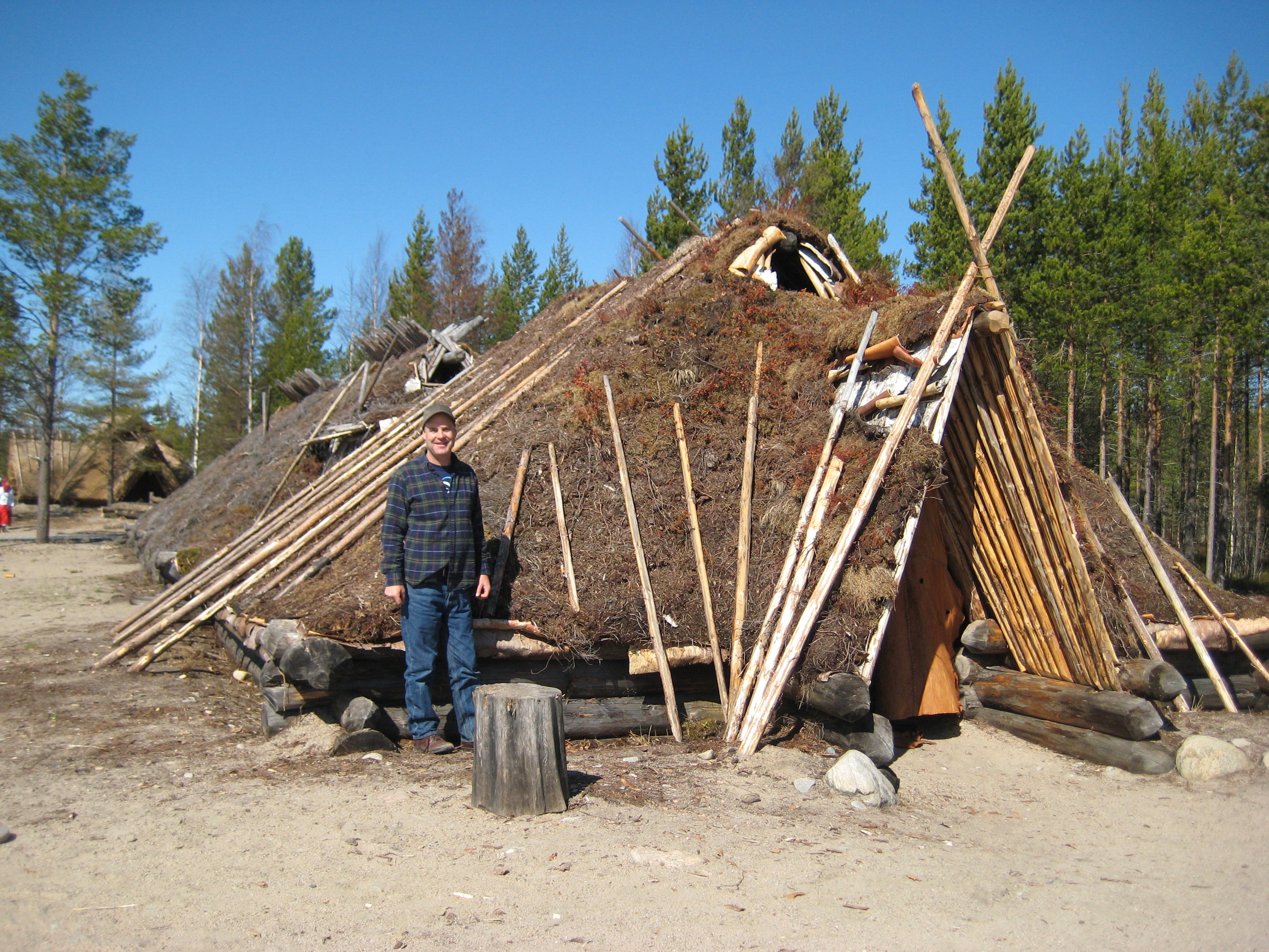 Michael Wing stands in front of a reconstructed pit house. At the Kierikki Stone Age Centre near Yli-Ii, Finland.