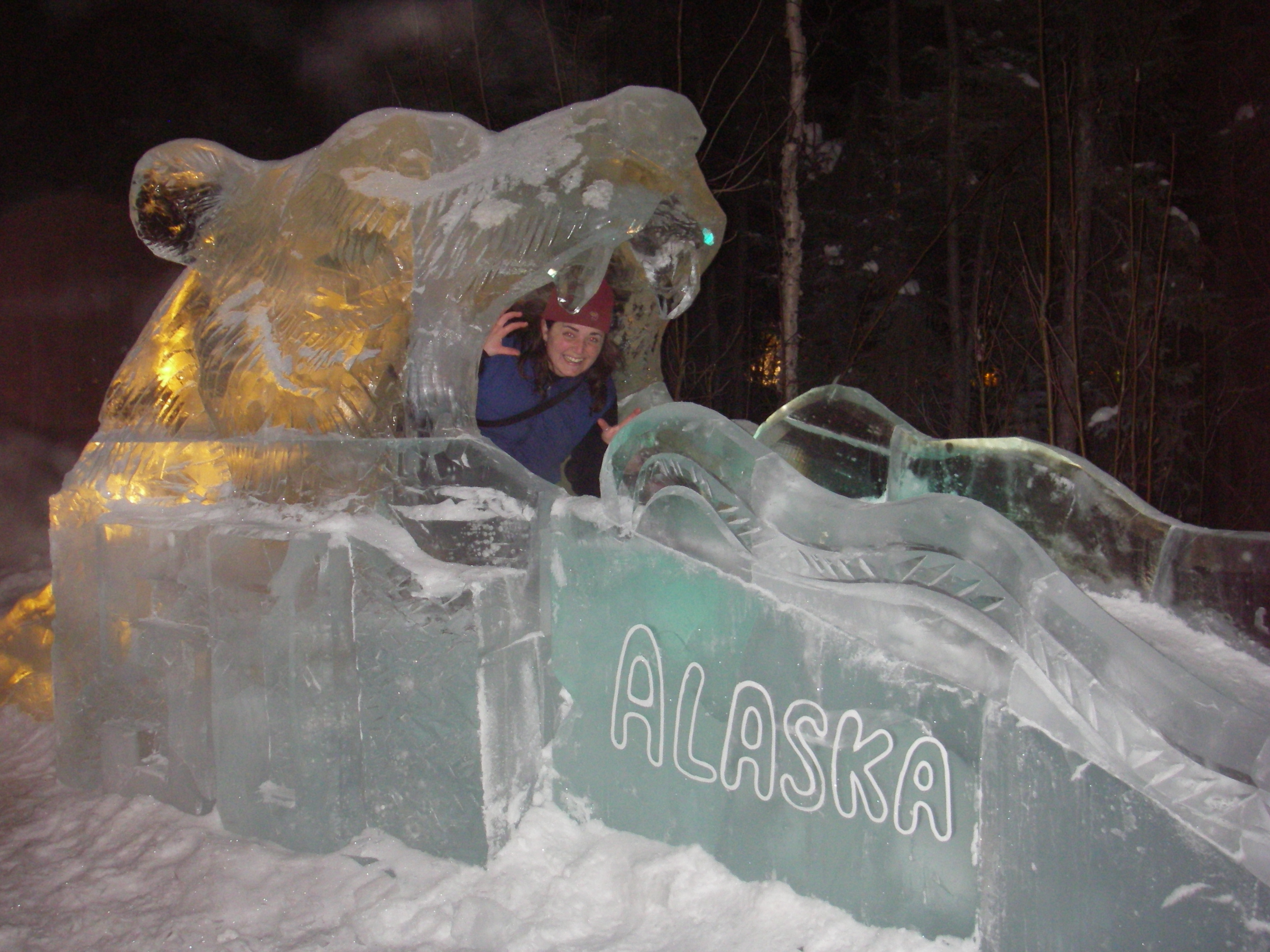 Sarah Diers is ready to slide down the tongue of the ice bear slide at the World Ice Art Championships in Fairbanks, Alaska.