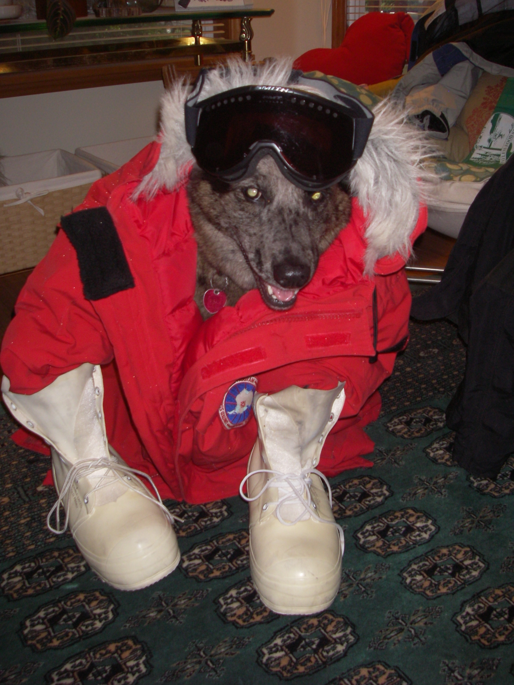 Lucy modeling bunny boots, "Big Red", and a pair of ski goggles. Langley, Washington.