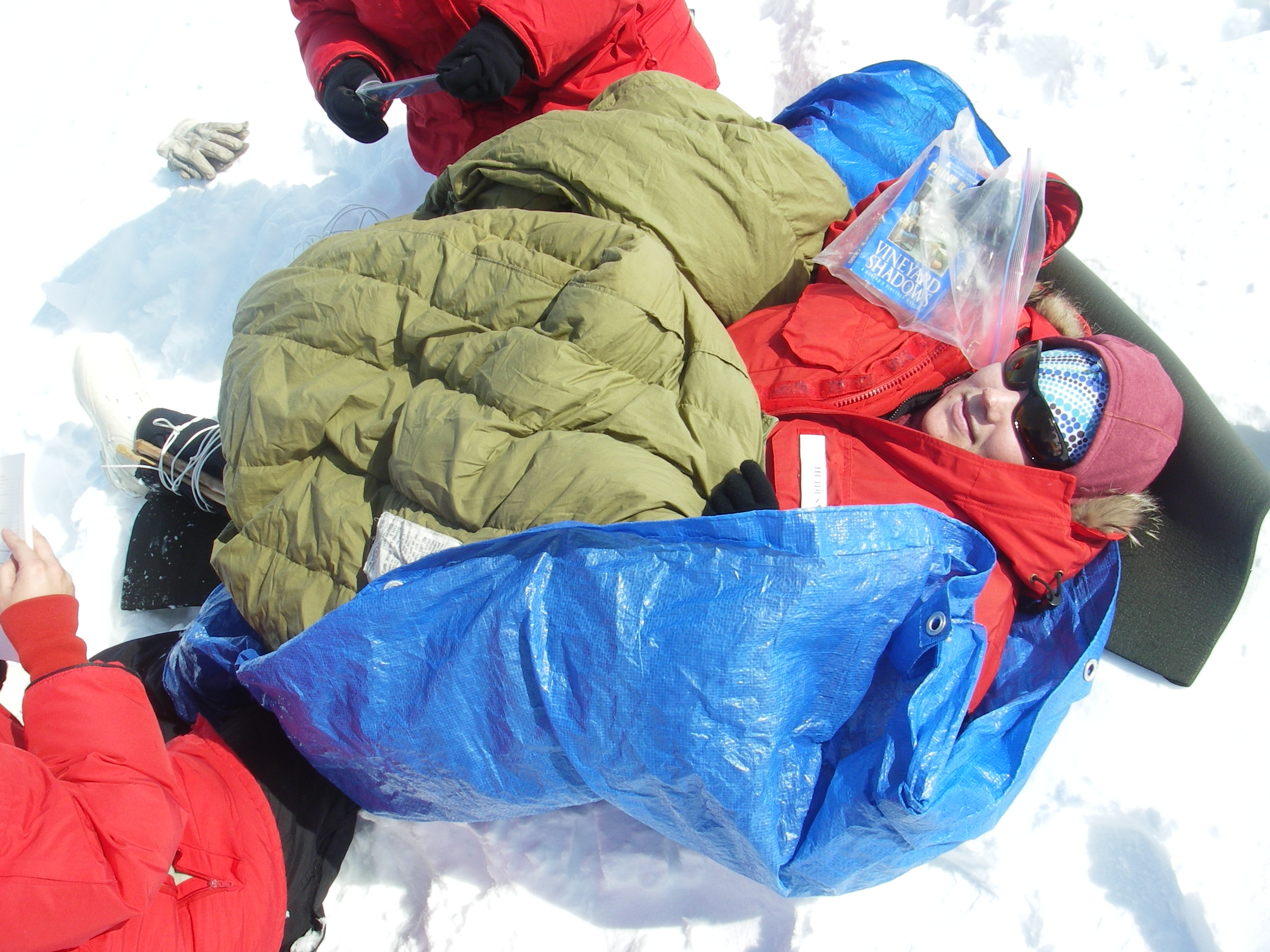 Heidi Smith receives first-aid for her "broken" leg. At the Happy Camper School near McMurdo Station, Antarctica.