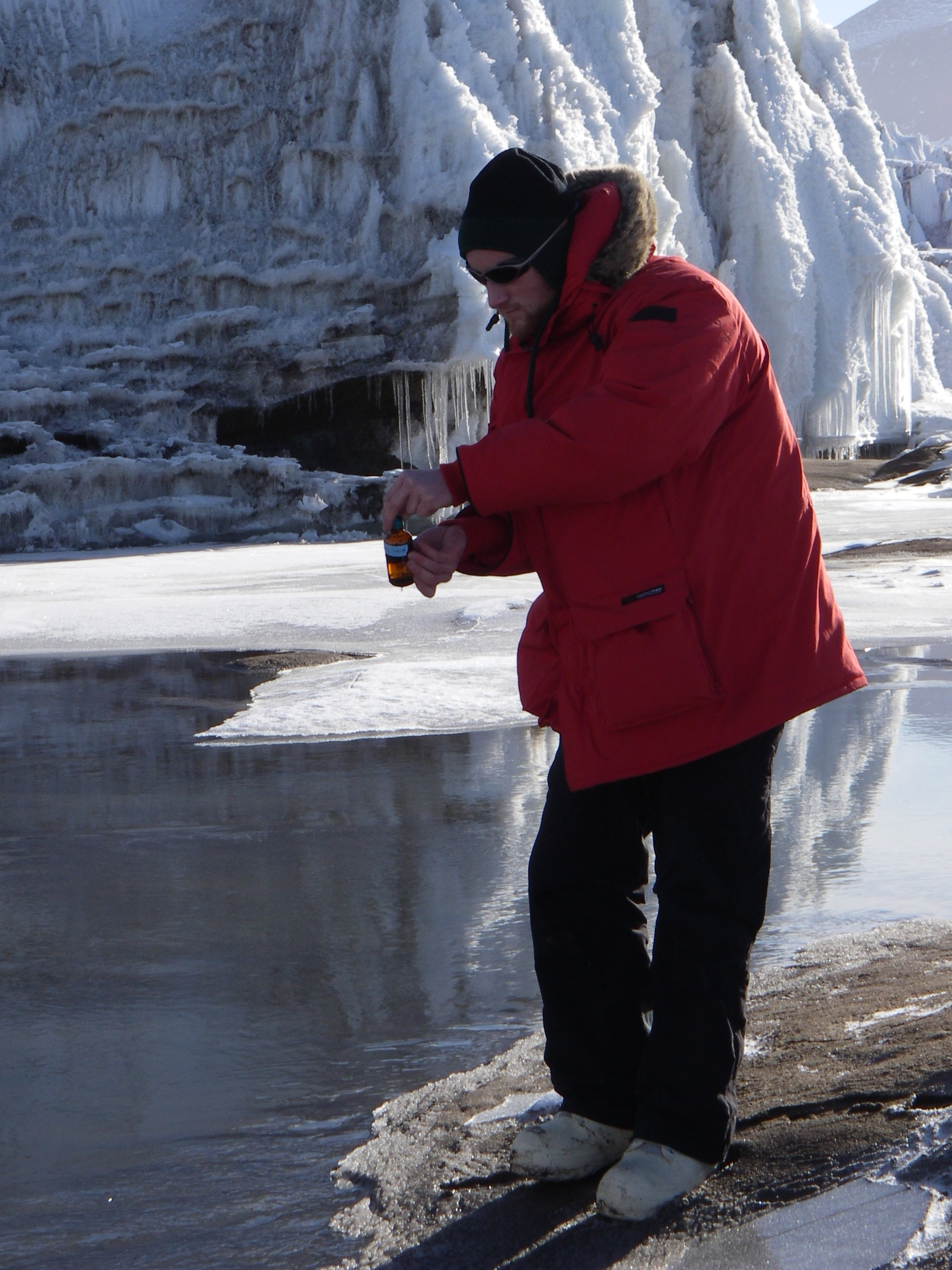 Collin Ward collects a water sample at Cotton Glacier, McMurdo Dry Valleys, Antarctica.